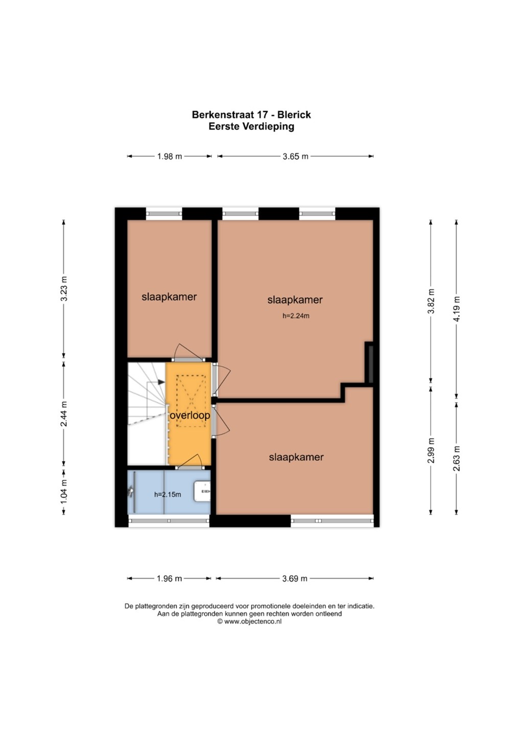 - Overloop met muurkast. - Slaapkamer 1 (4,19 x 3,65m) - Slaapkamer 2 ( 3.23 x 1,98m) - Slaapkamer 3 (3,69 x 2,63m) - Compacte badkamer (1,96 x 1,04m) met douche en wastafel.