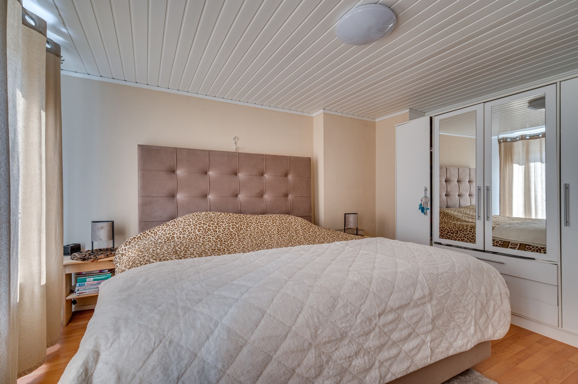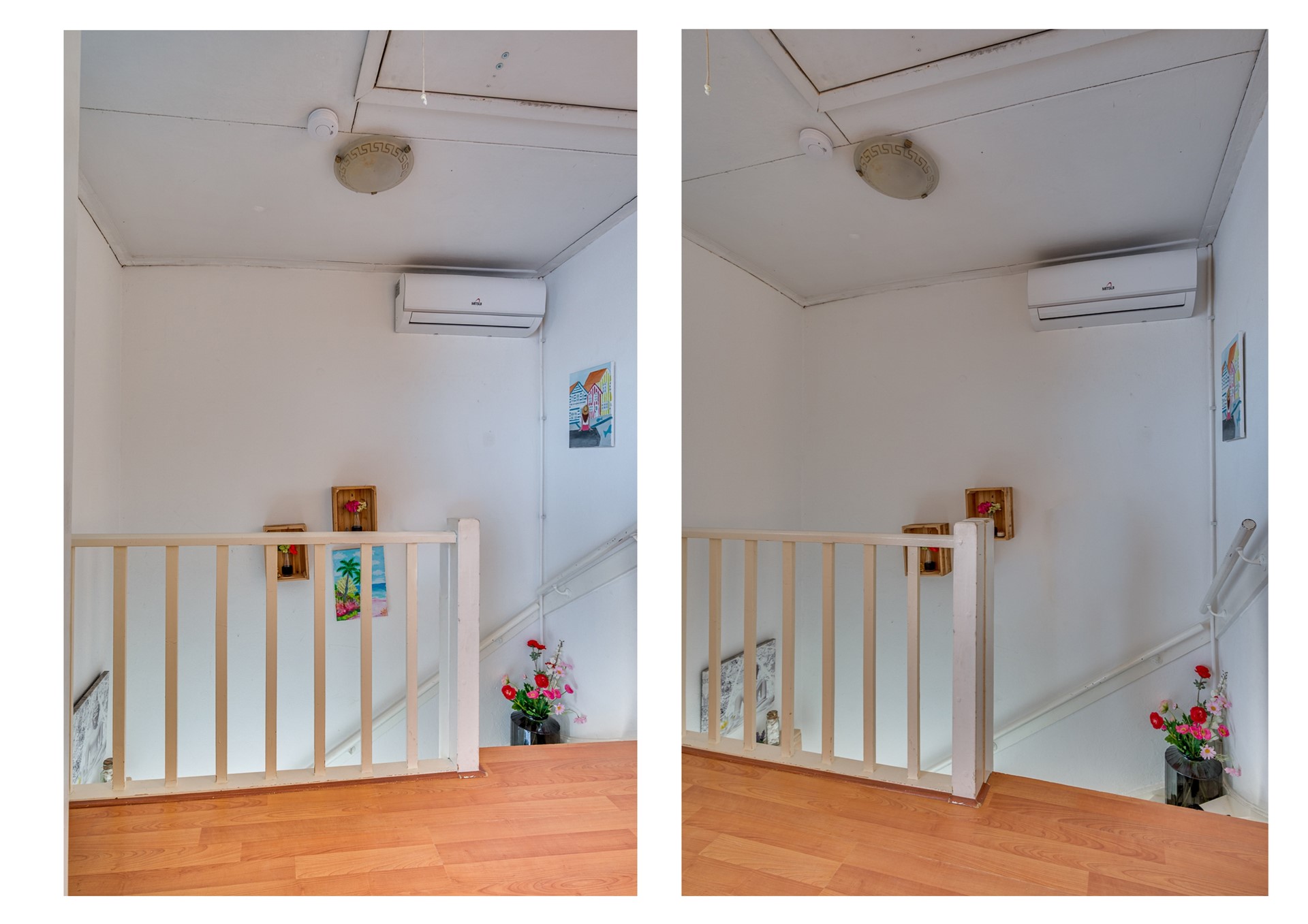 Op de eerste verdieping bevinden zich drie slaapkamers en een compacte, nette badkamer met douche en wastafel. De slaapkamers zijn voorzien van laminaatvloeren, rolluiken en airconditioning, wat zorgt voor extra comfort.