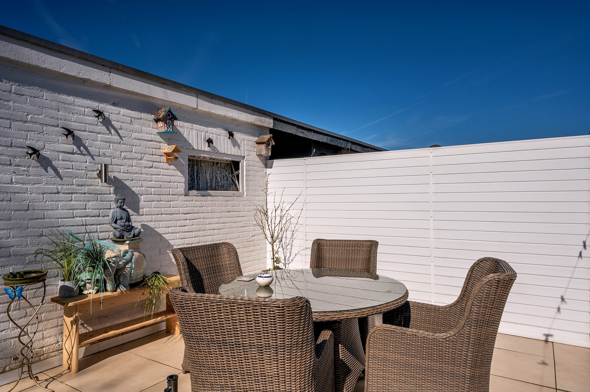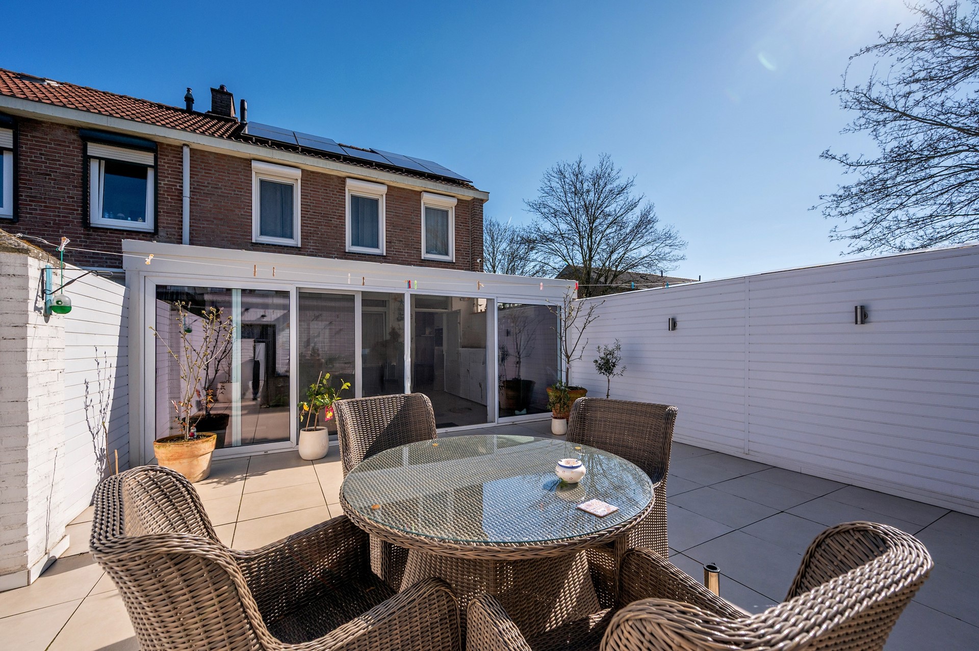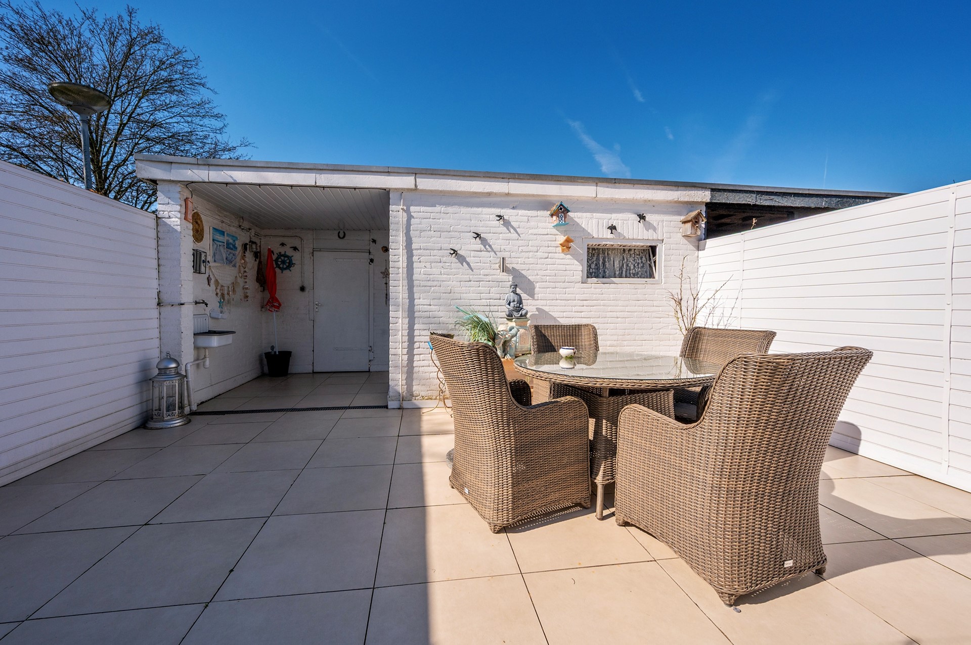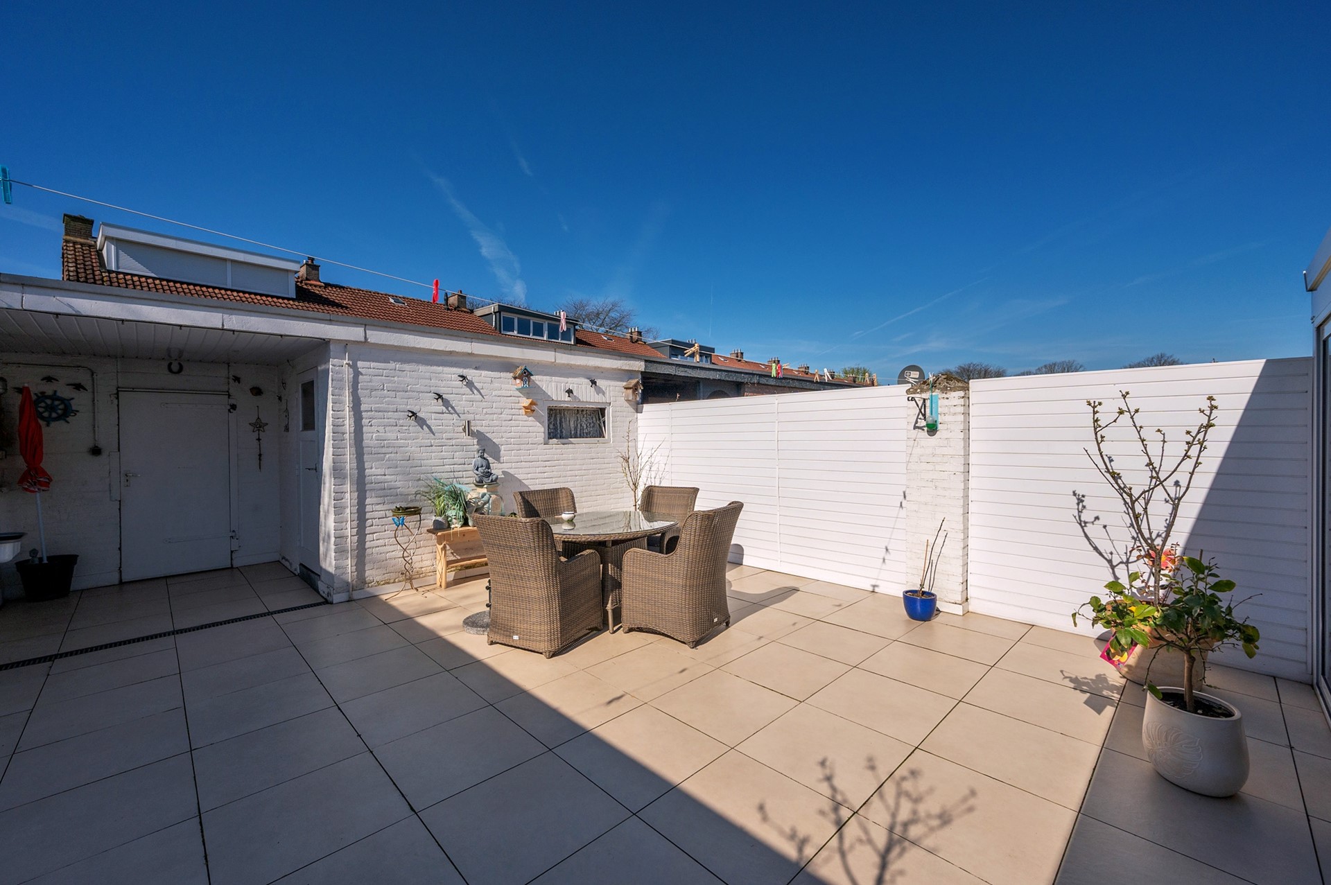 - Betegelde achtertuin gelegen op het westen met berging (3,48 x 2,26m) en vrije achterom.