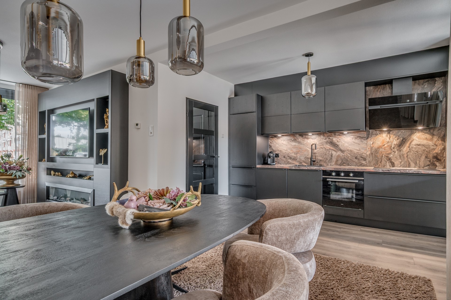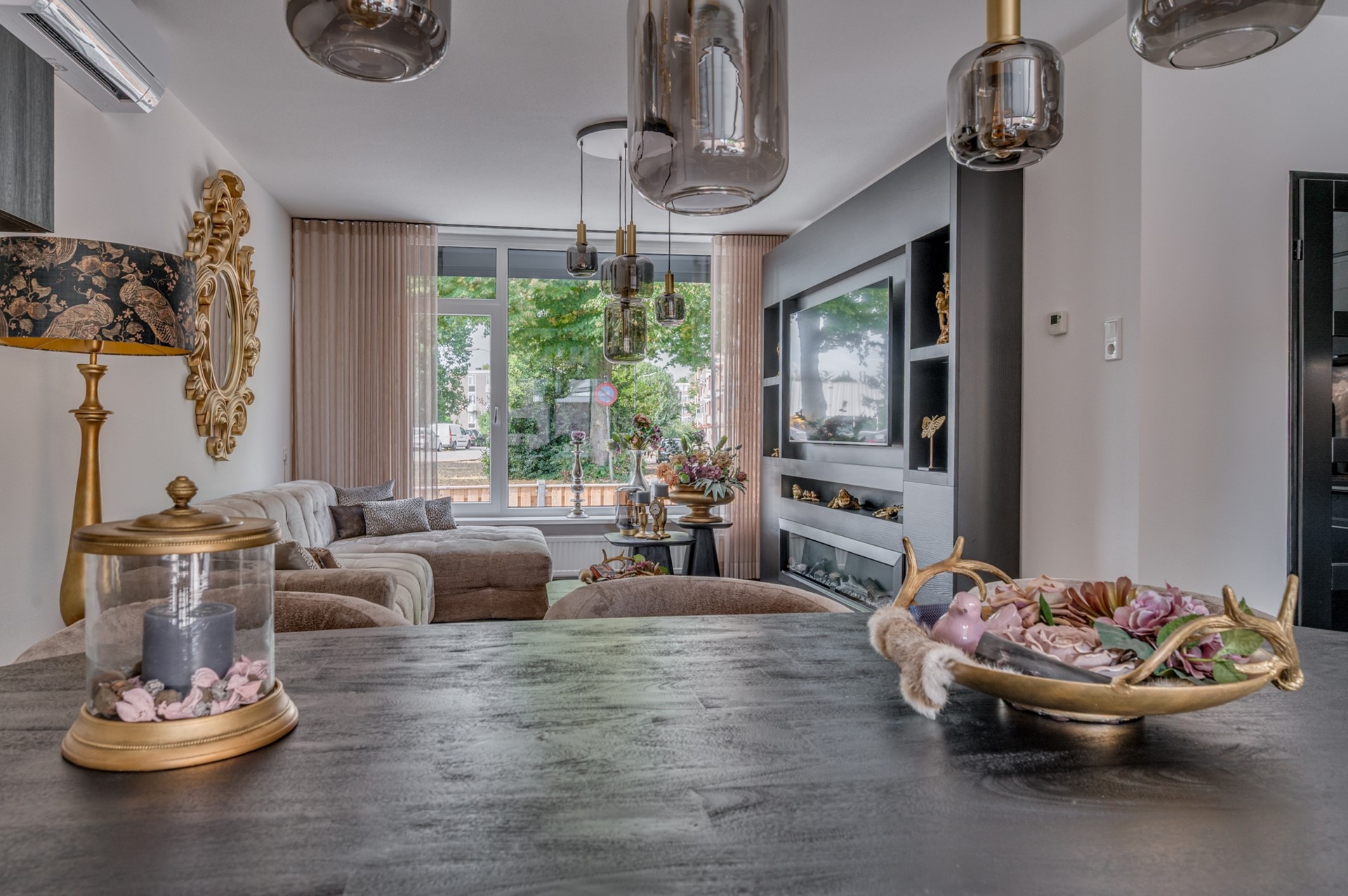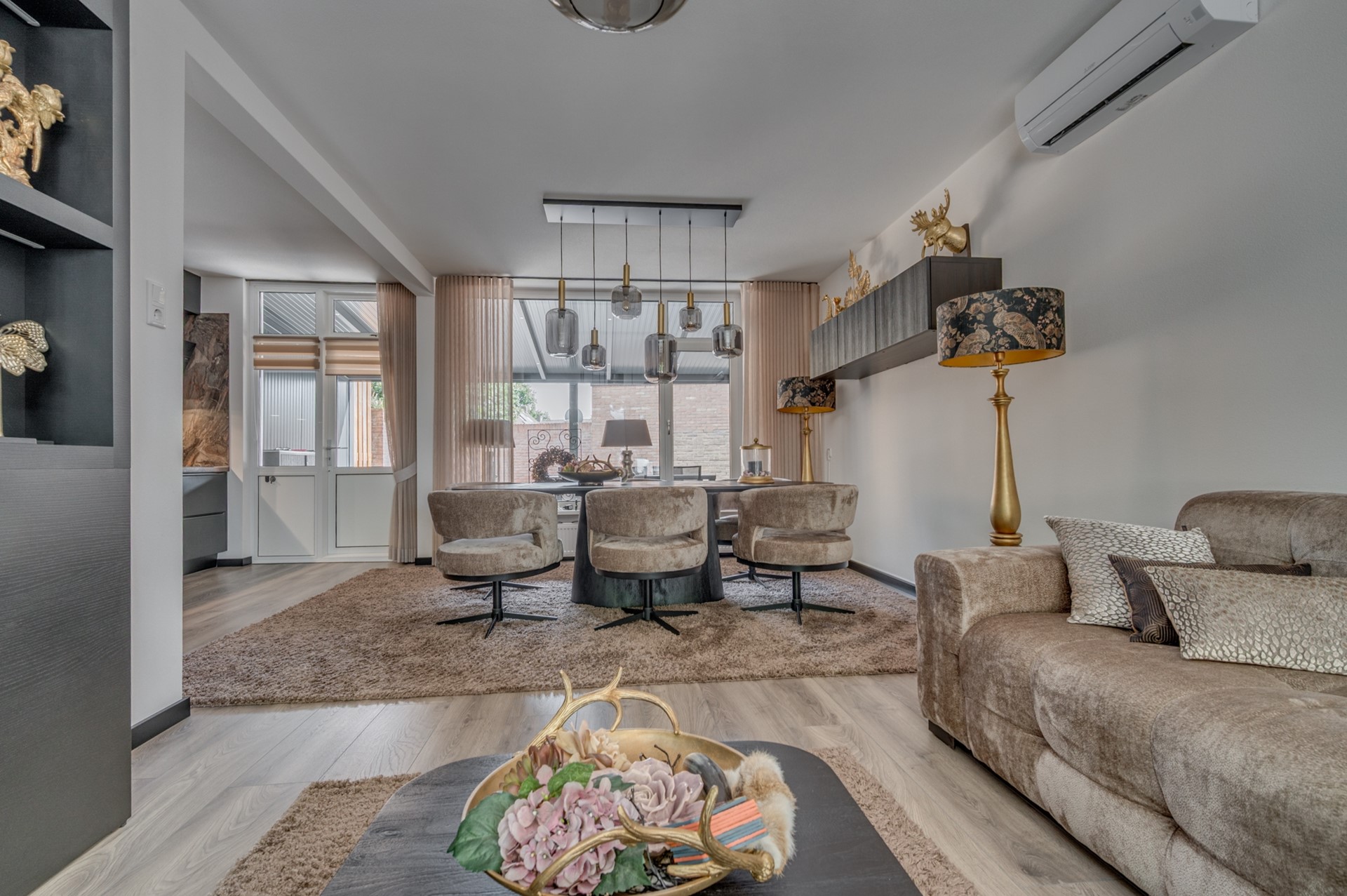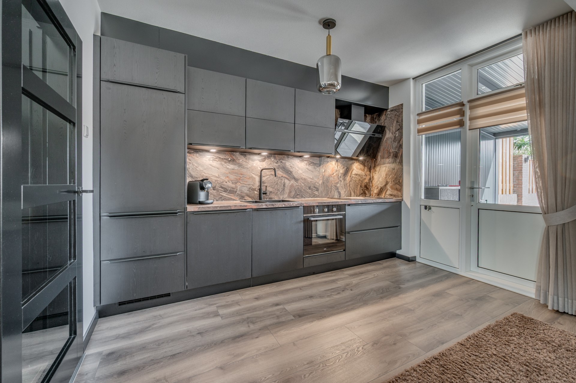 - Entree met trapkast en meterkast. - Fraai betegeld toilet met fonteintje. - Woonkamer met fraaie afwerking muren en vloer. Airconditioning aanwezig. - Open keuken met luxe uitgevoerde inbouwcombinatie inclusief inbouwapparatuur: koelkast, inductie kookplaat, afzuigkap, vaatwasmachine en combi oven.