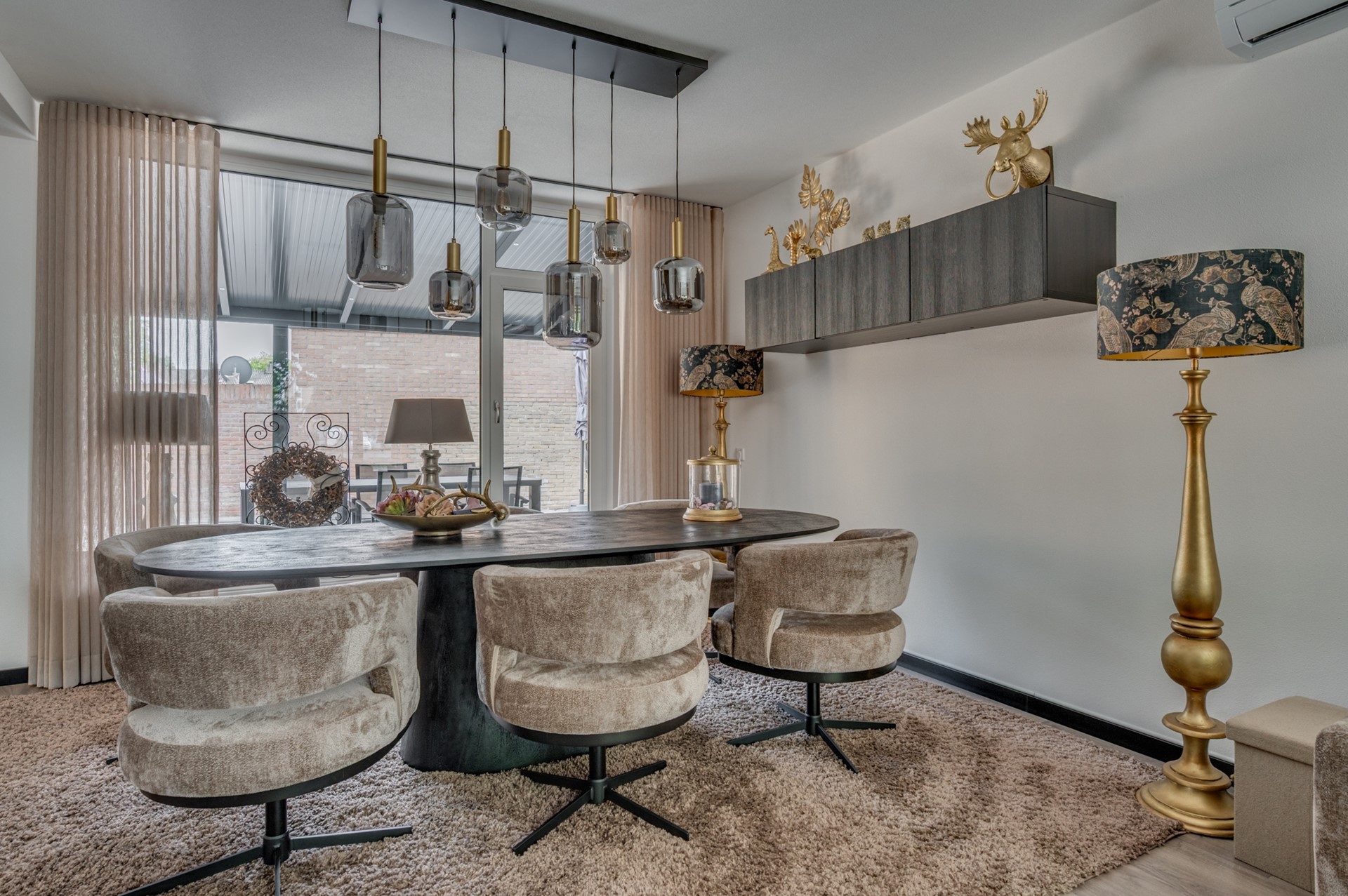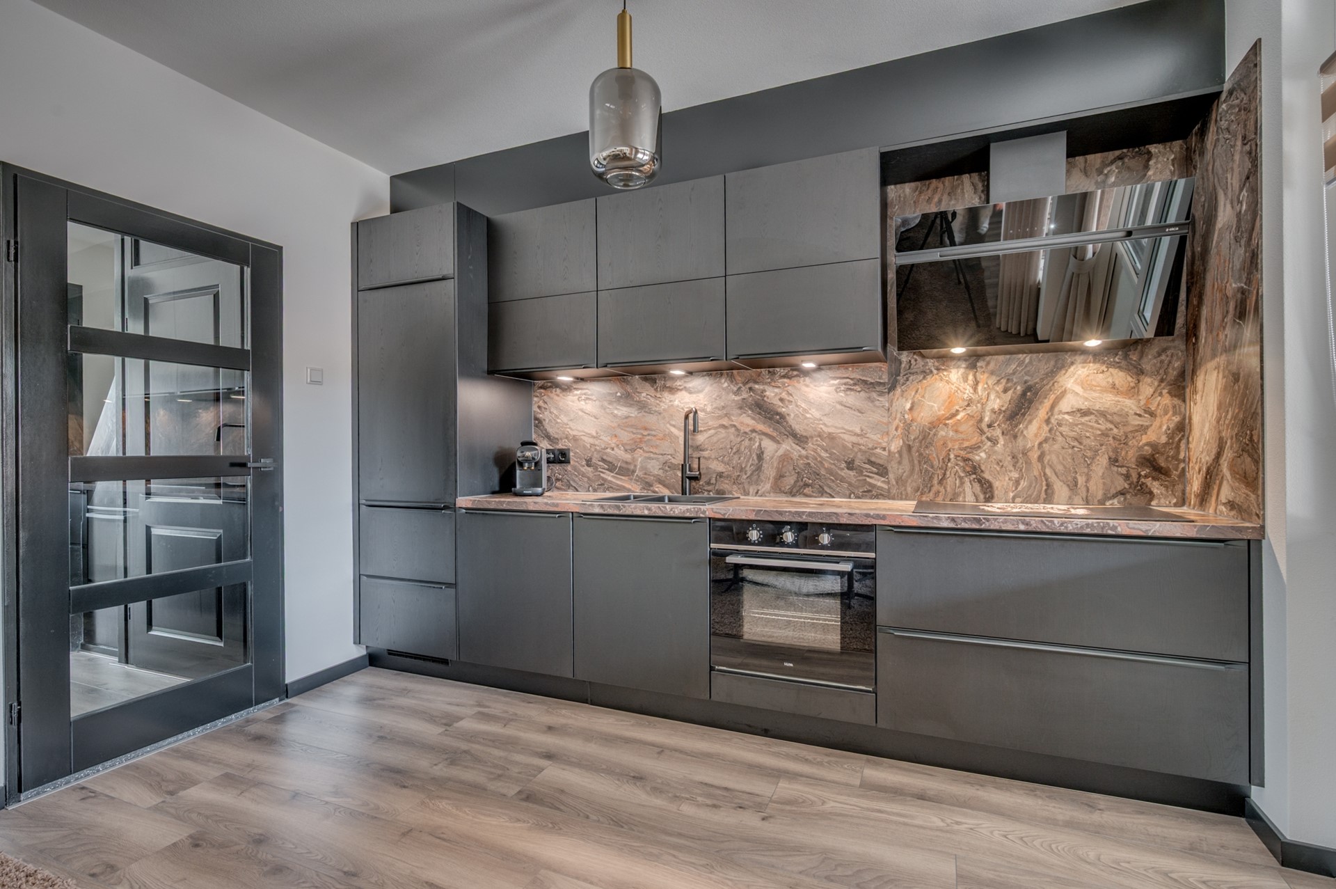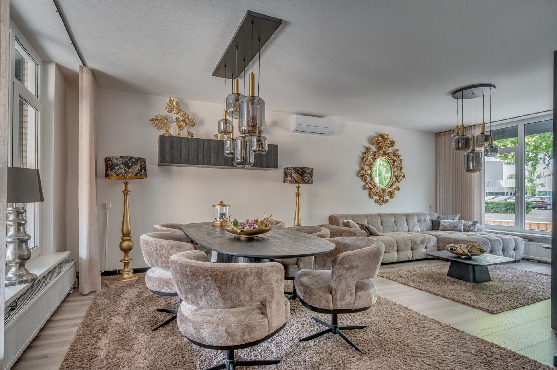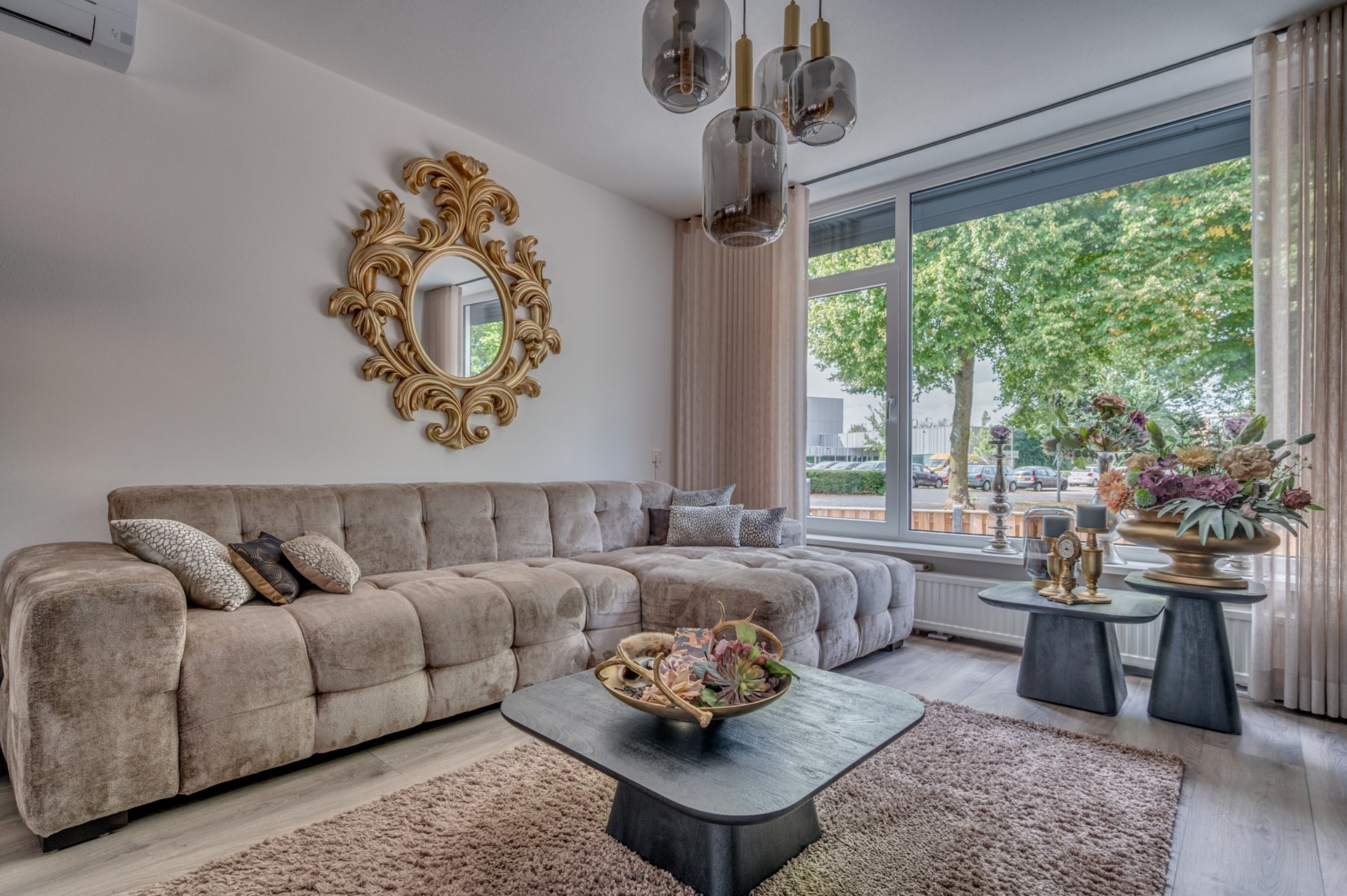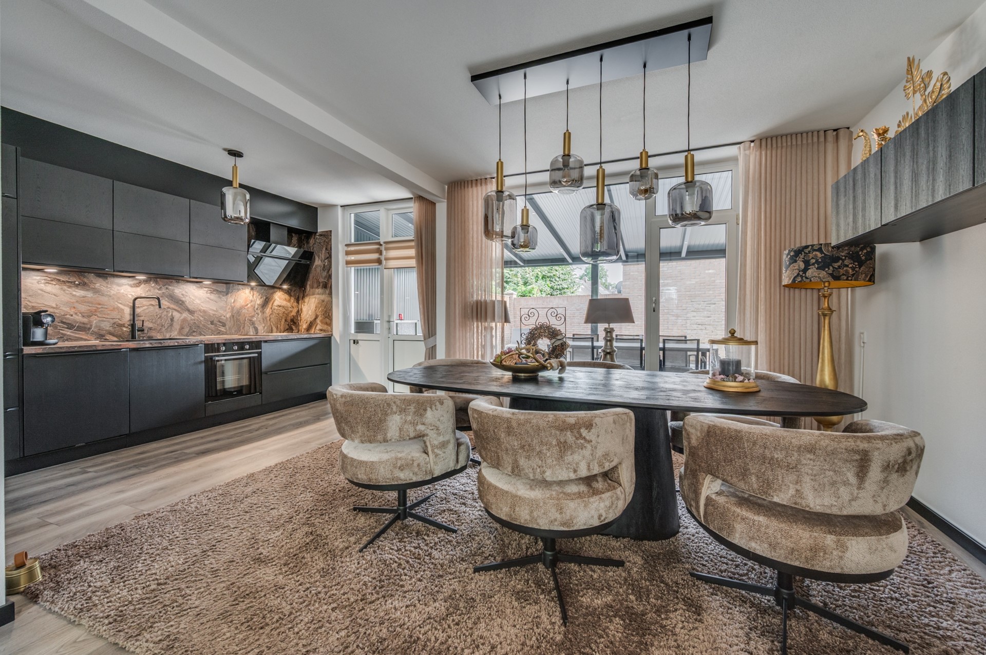 - Entree met trapkast en meterkast. - Fraai betegeld toilet met fonteintje. - Woonkamer met fraaie afwerking muren en vloer. Airconditioning aanwezig. - Open keuken met luxe uitgevoerde inbouwcombinatie inclusief inbouwapparatuur: koelkast, inductie kookplaat, afzuigkap, vaatwasmachine en combi oven.
