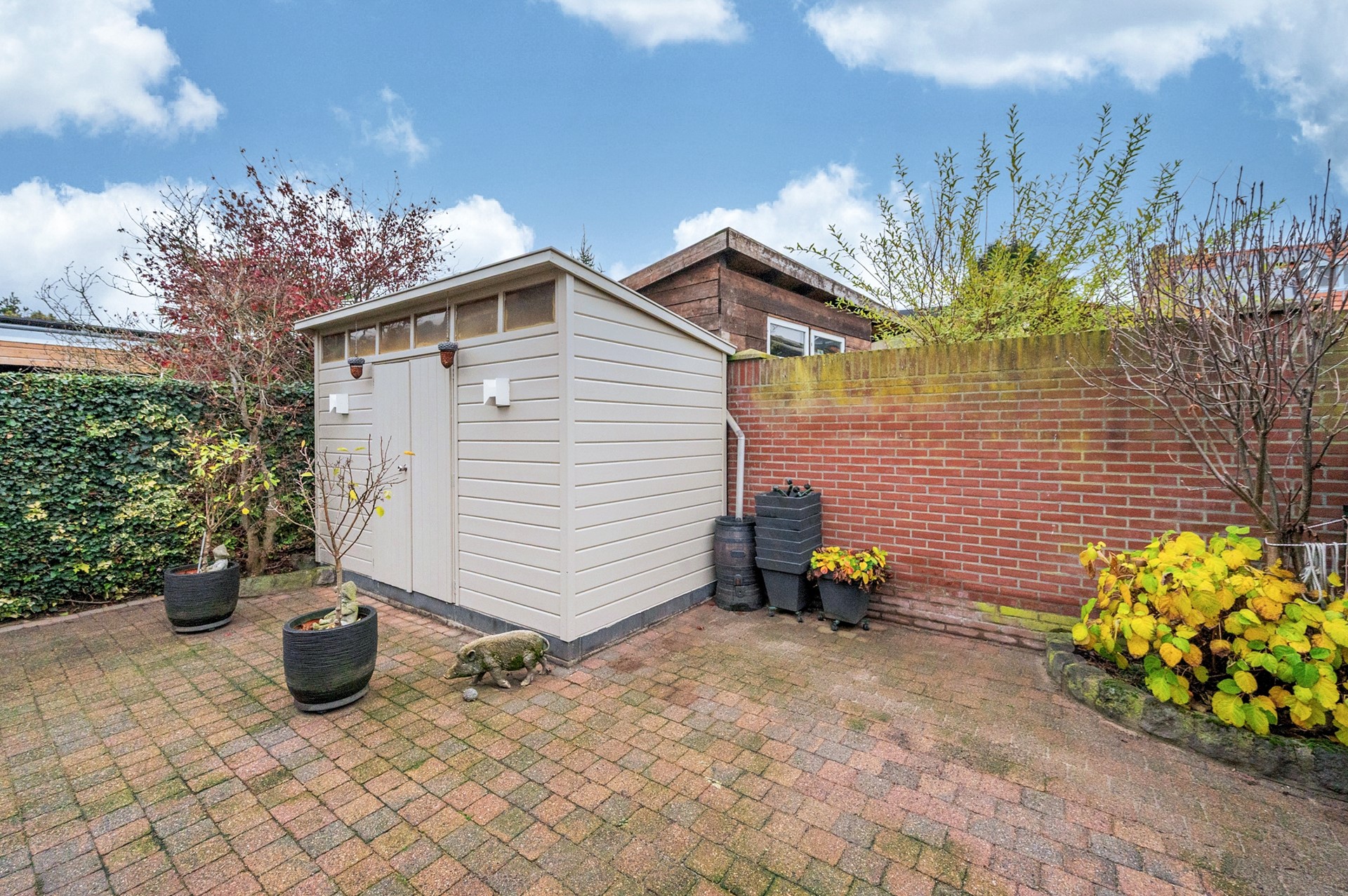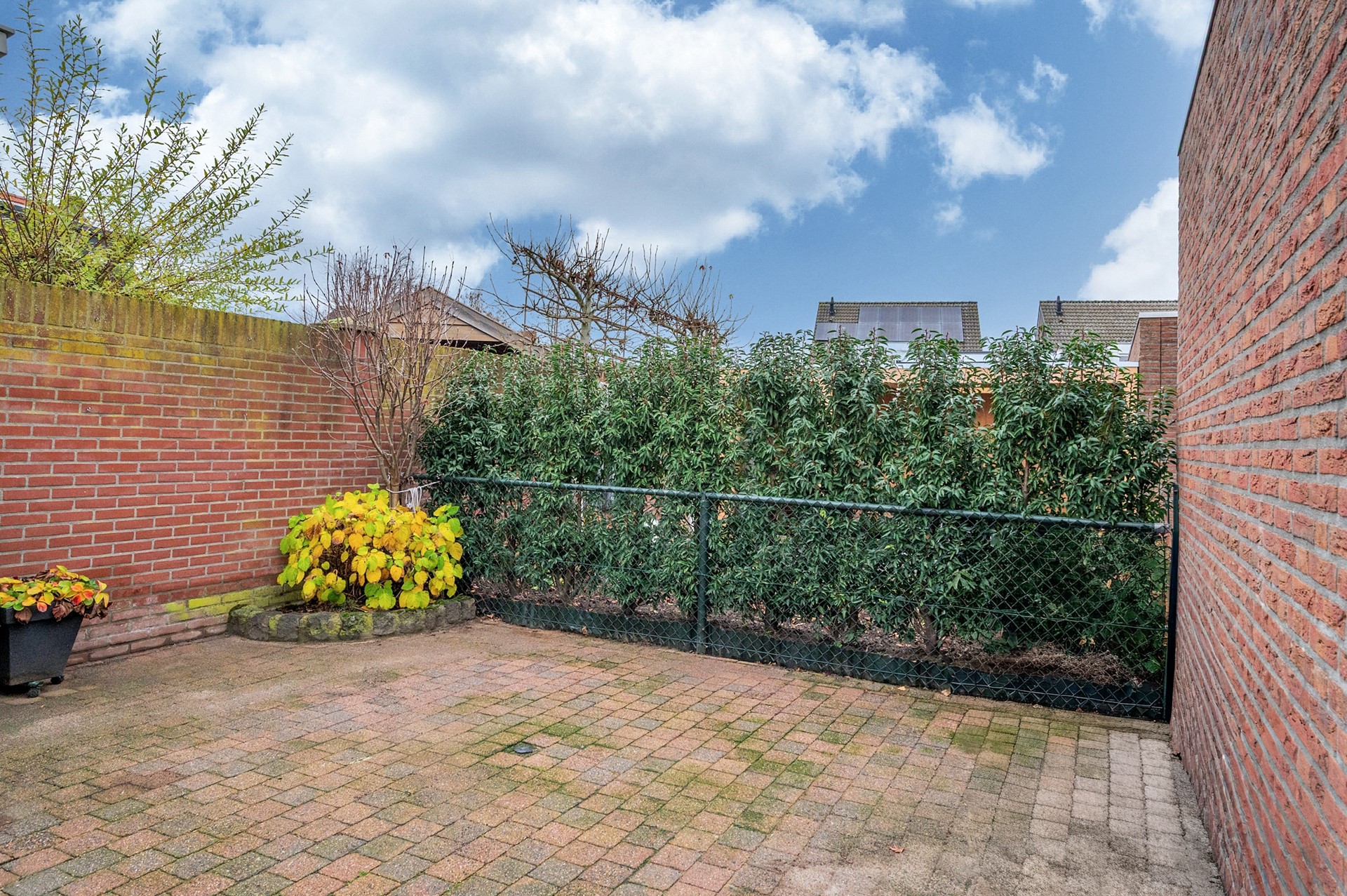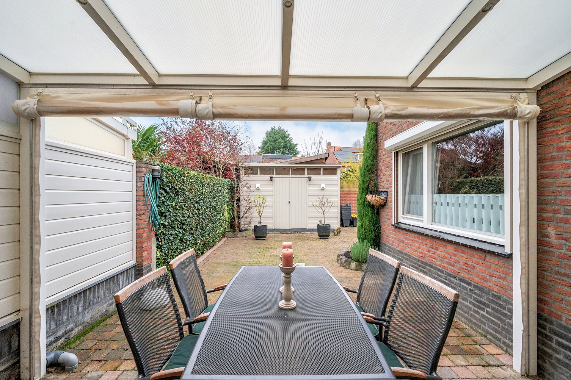 De patio-tuin gesitueerd op het Noord-Westen. De tuin is grotendeels beklinkerd, voorzien van een terrasoverkapping en houten tuinberging.
