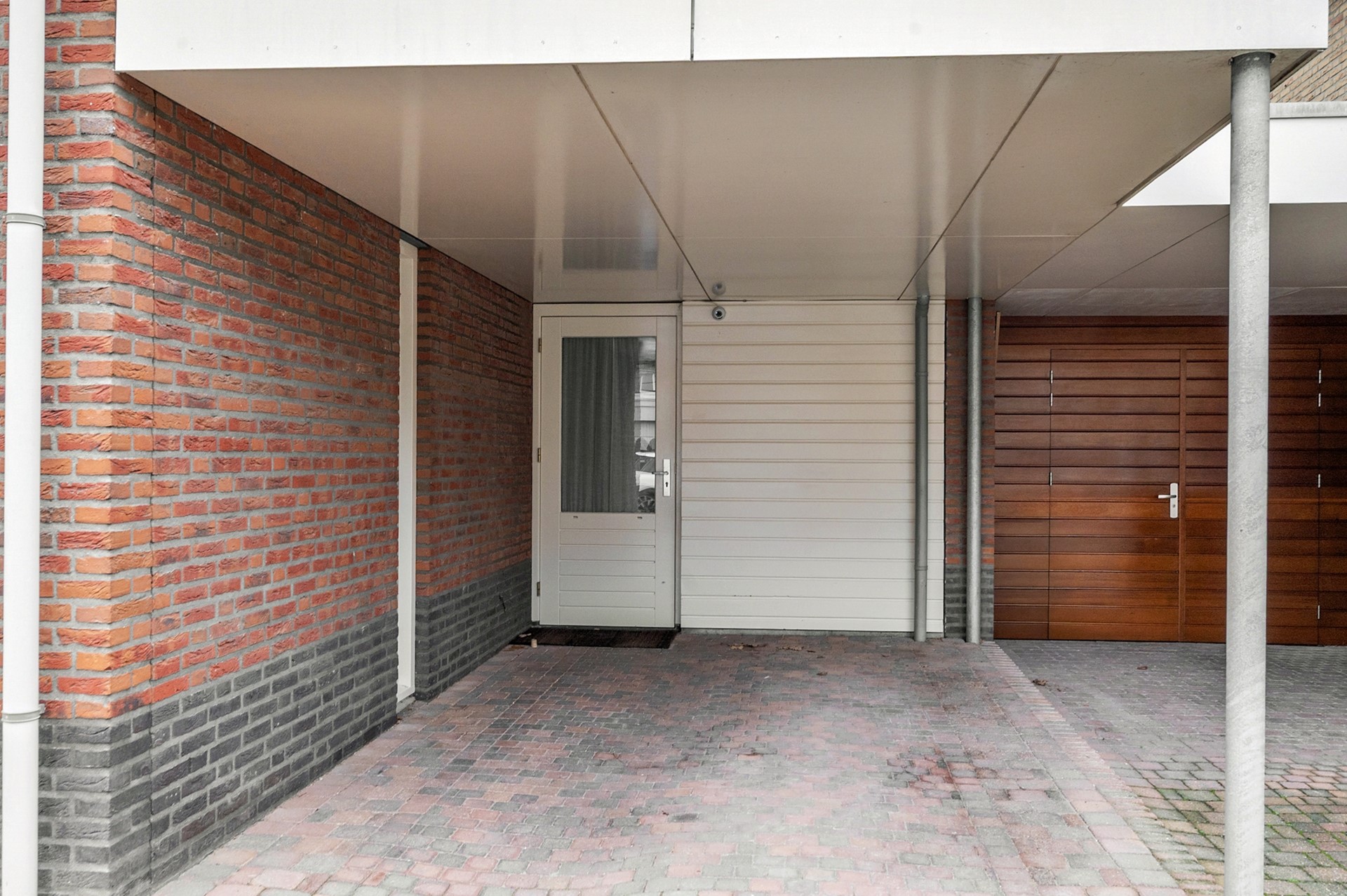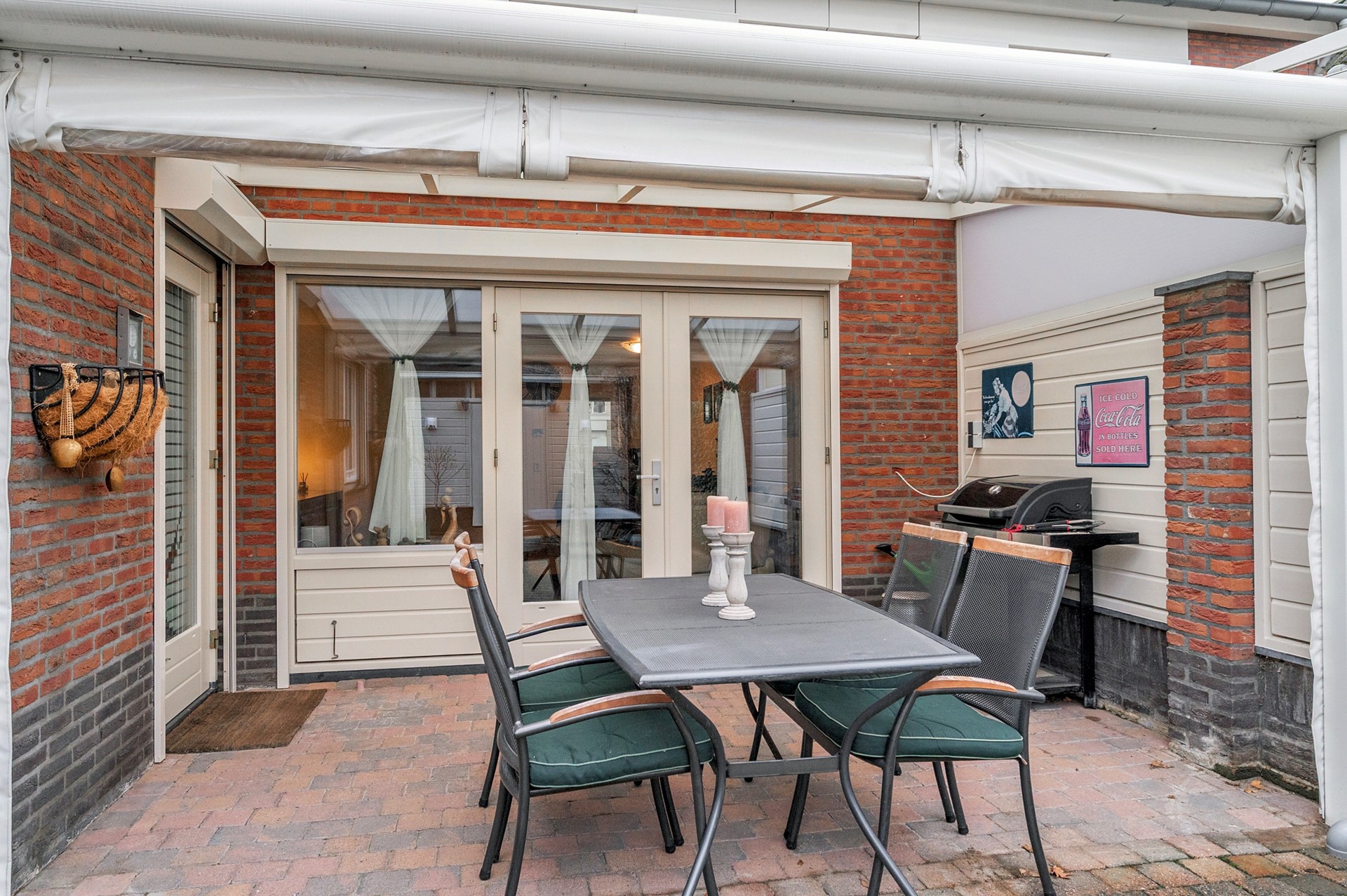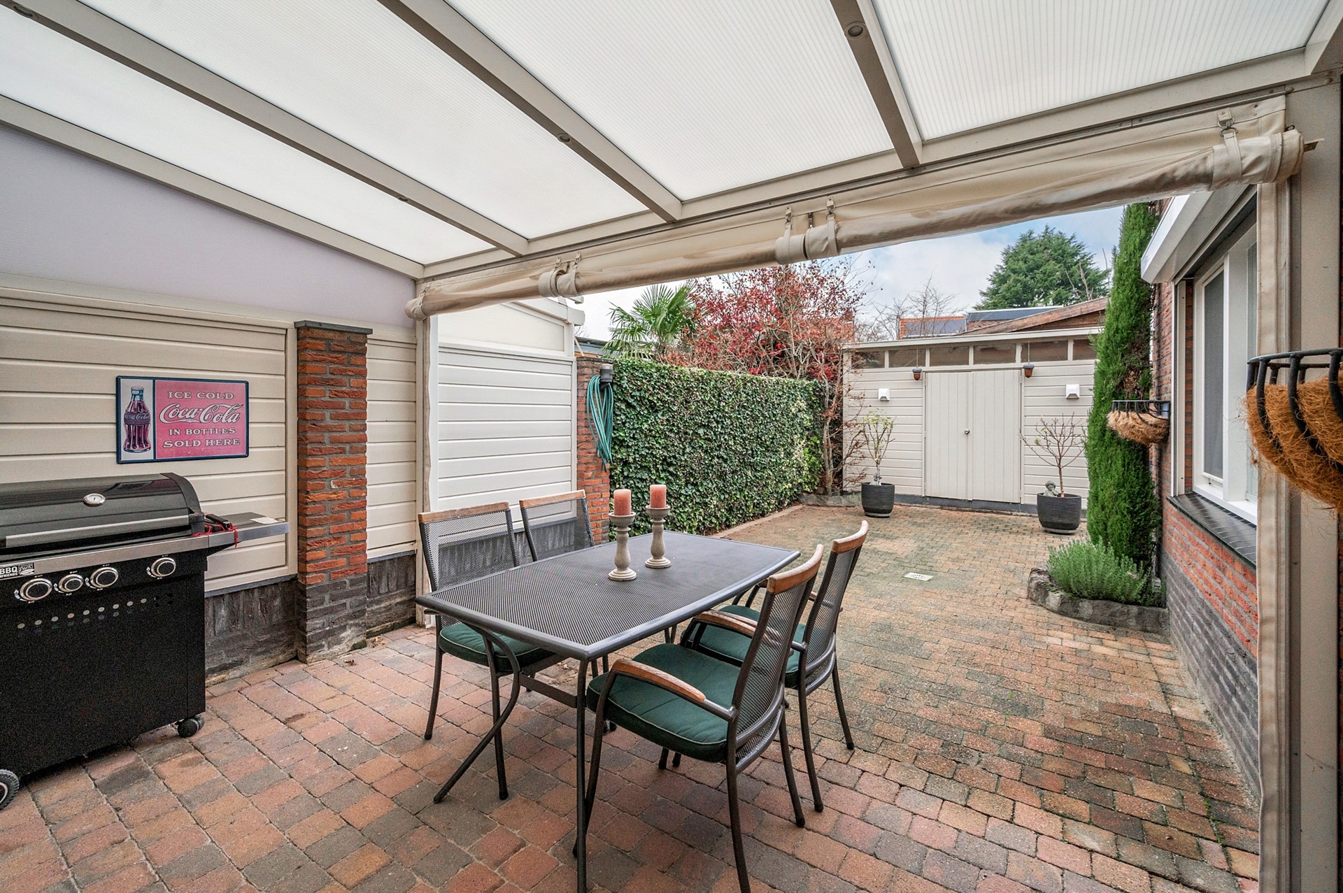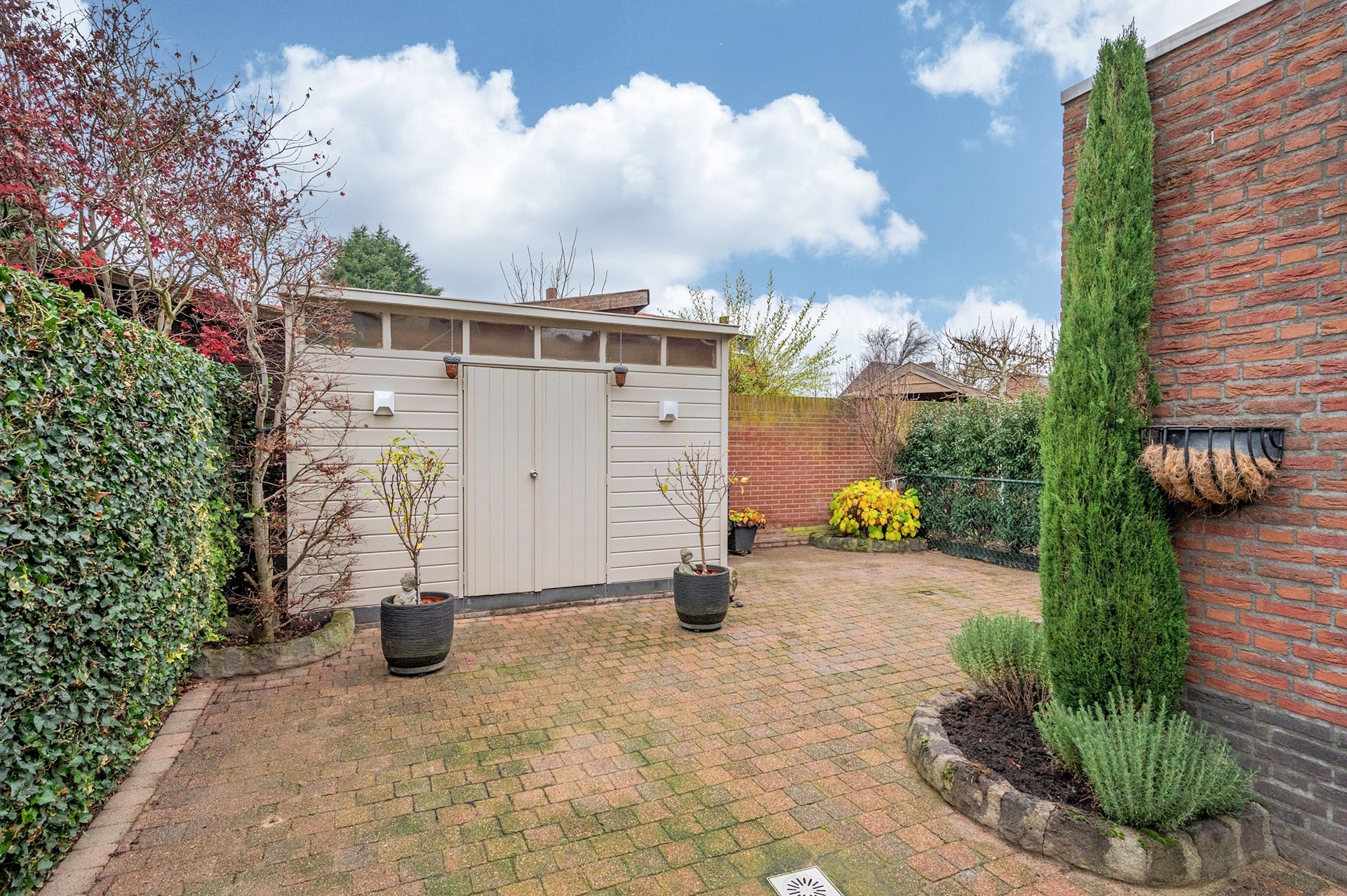 De patio-tuin gesitueerd op het Noord-Westen. De tuin is grotendeels beklinkerd, voorzien van een terrasoverkapping en houten tuinberging.