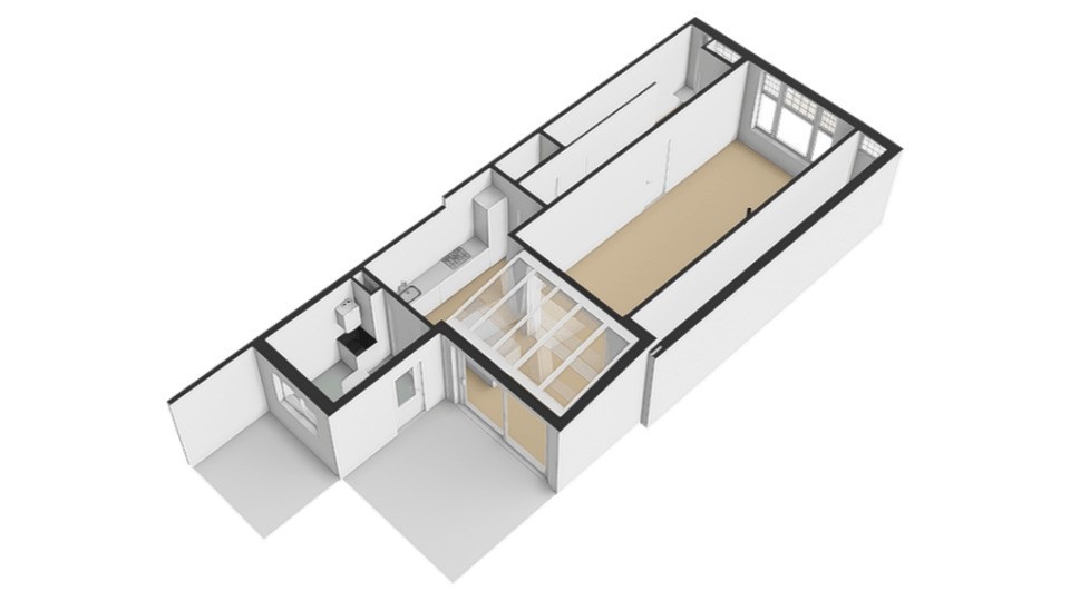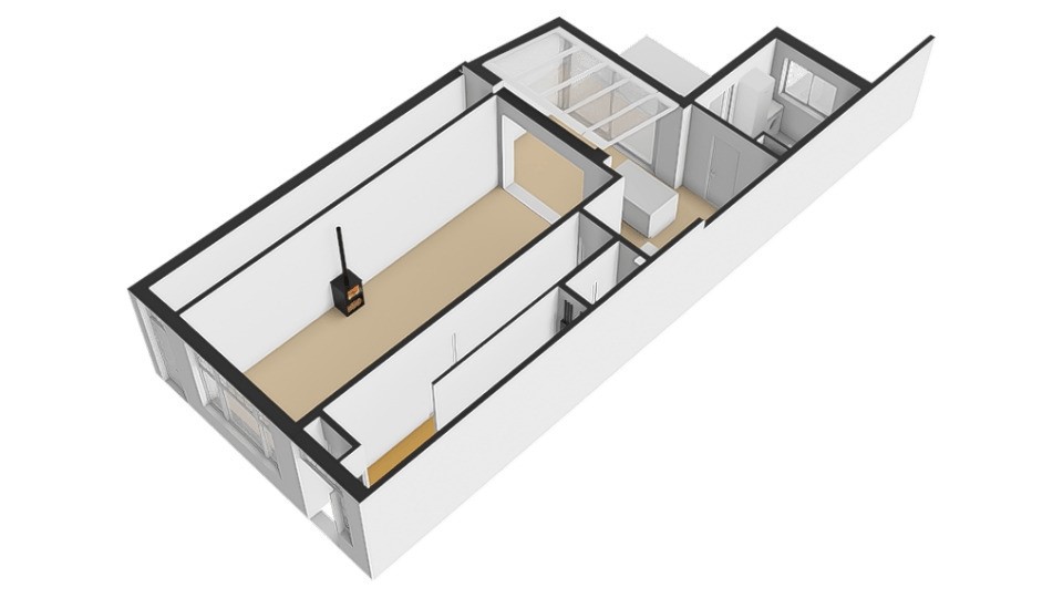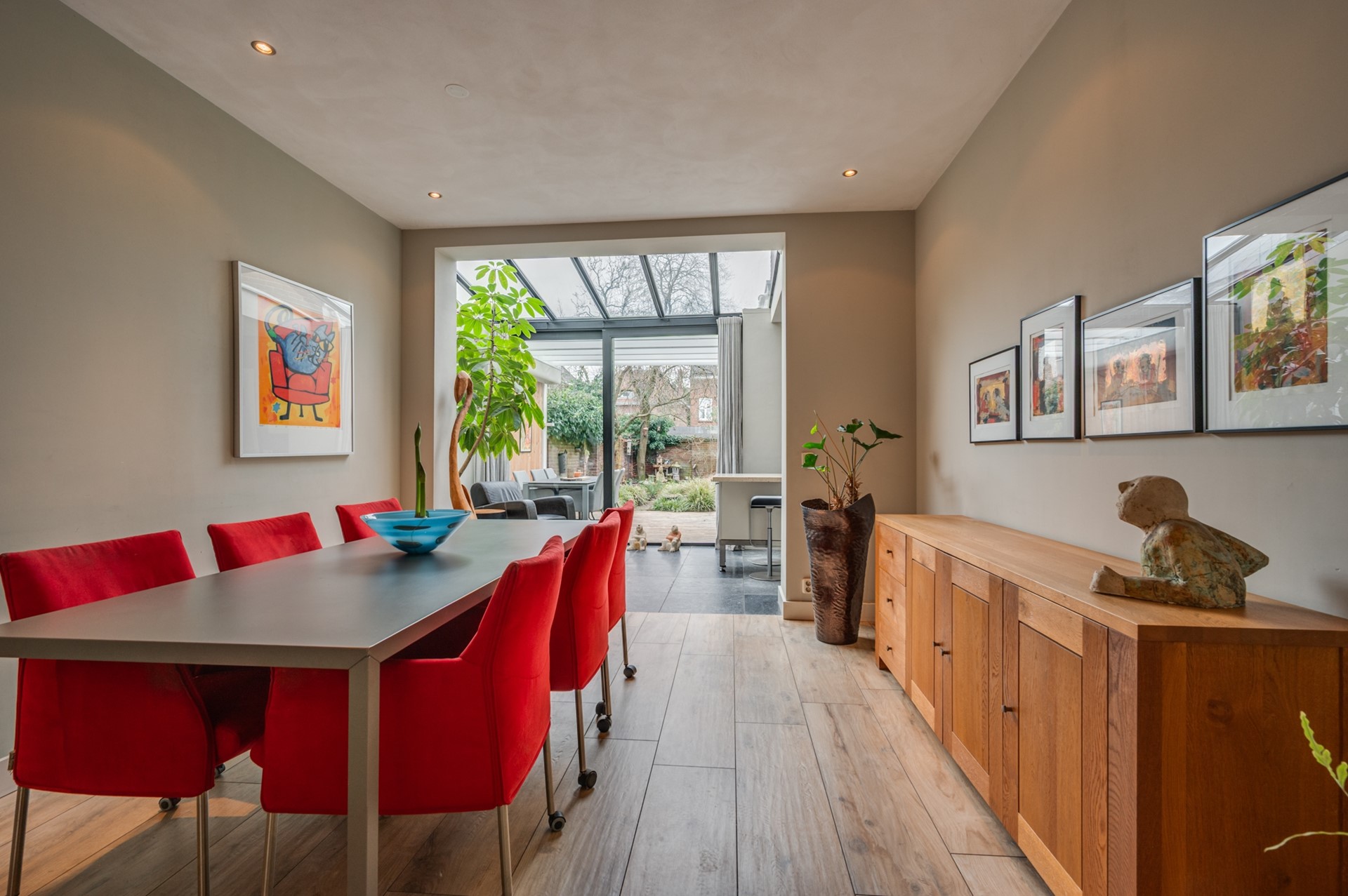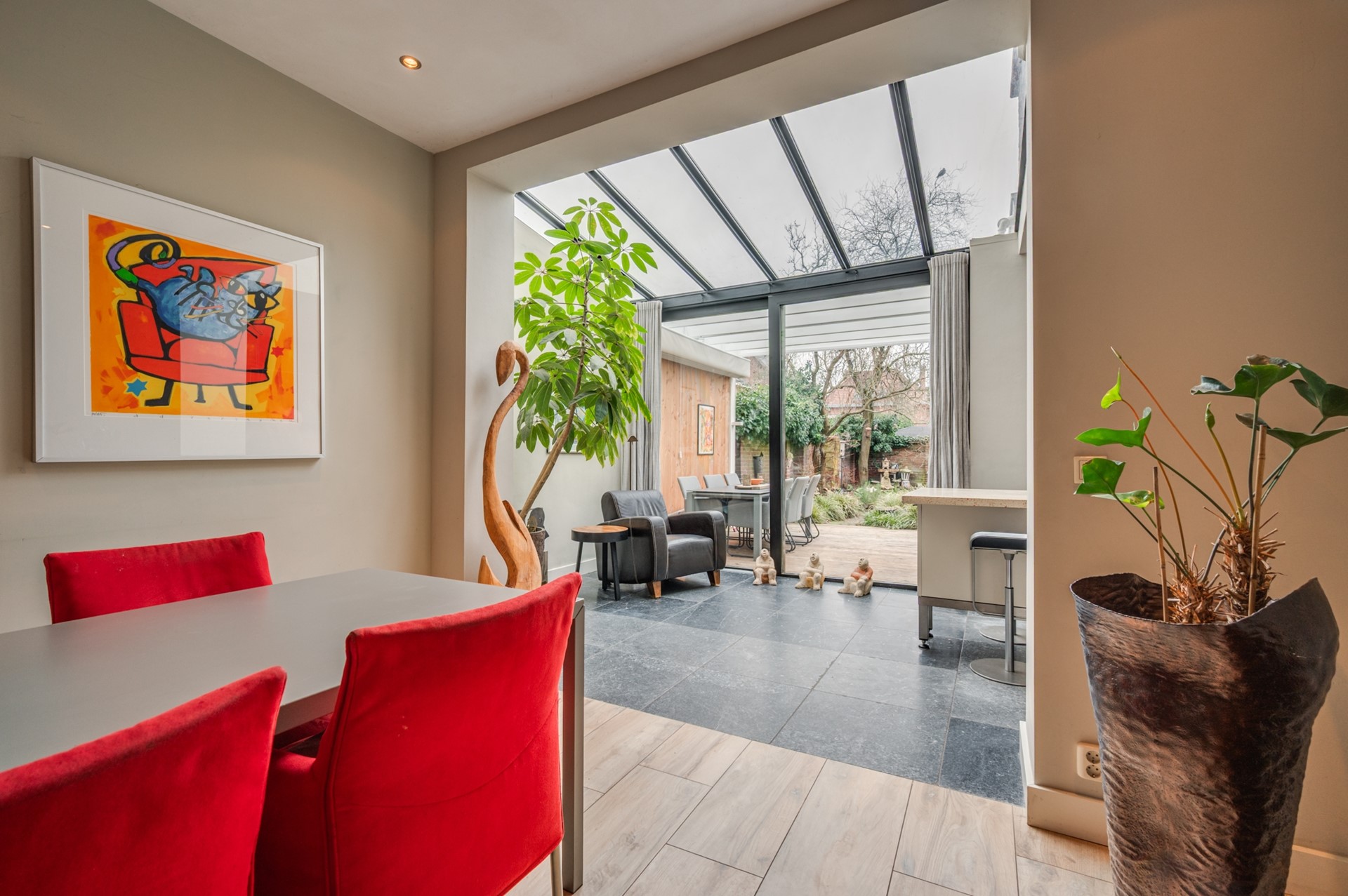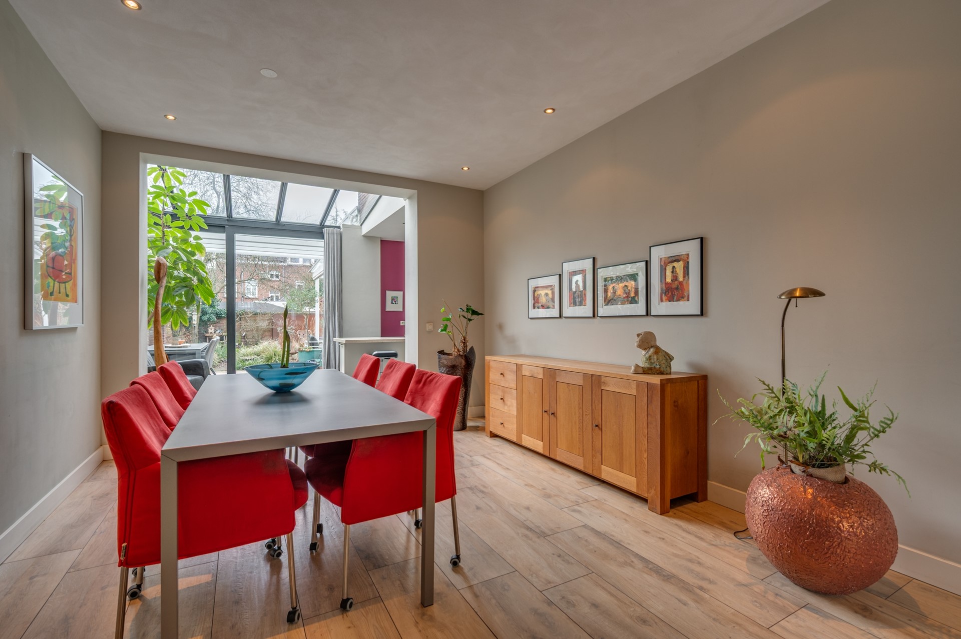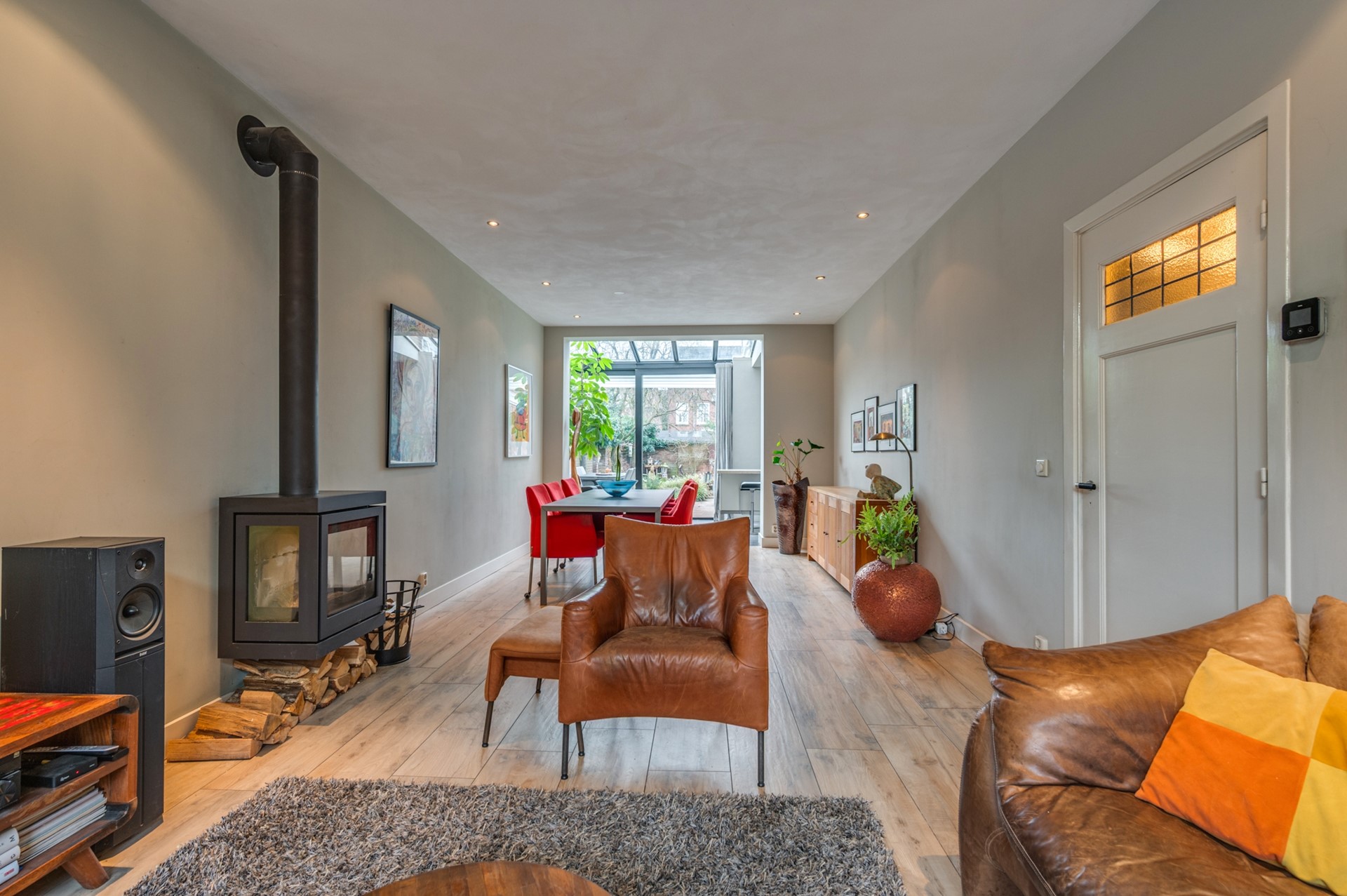 De begane grond is heerlijk licht dankzij de serre. Via de grote glazen schuifdeur loopt de woonkamer naadloos over in de tuin, waardoor binnen en buiten één geheel vormen . De glazen overkapping met zonwering maken het mogelijk om in elk seizoen van het buitenleven te genieten.