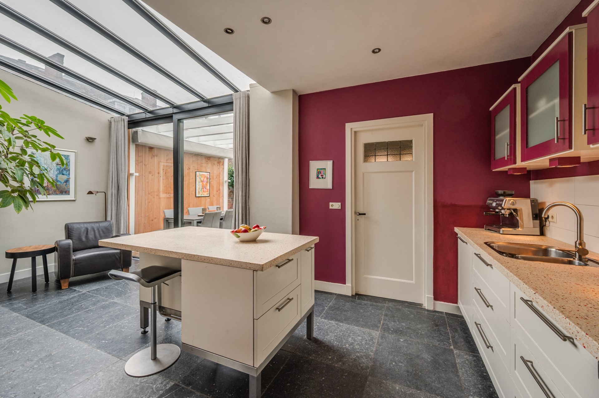 - Serre met aansluitend keuken met complete inbouwcombinatie met inbouwapparatuur: koelkast, 5 pits gaskookplaat, afzuigkap, vaatwasmachine en Boretti oven.