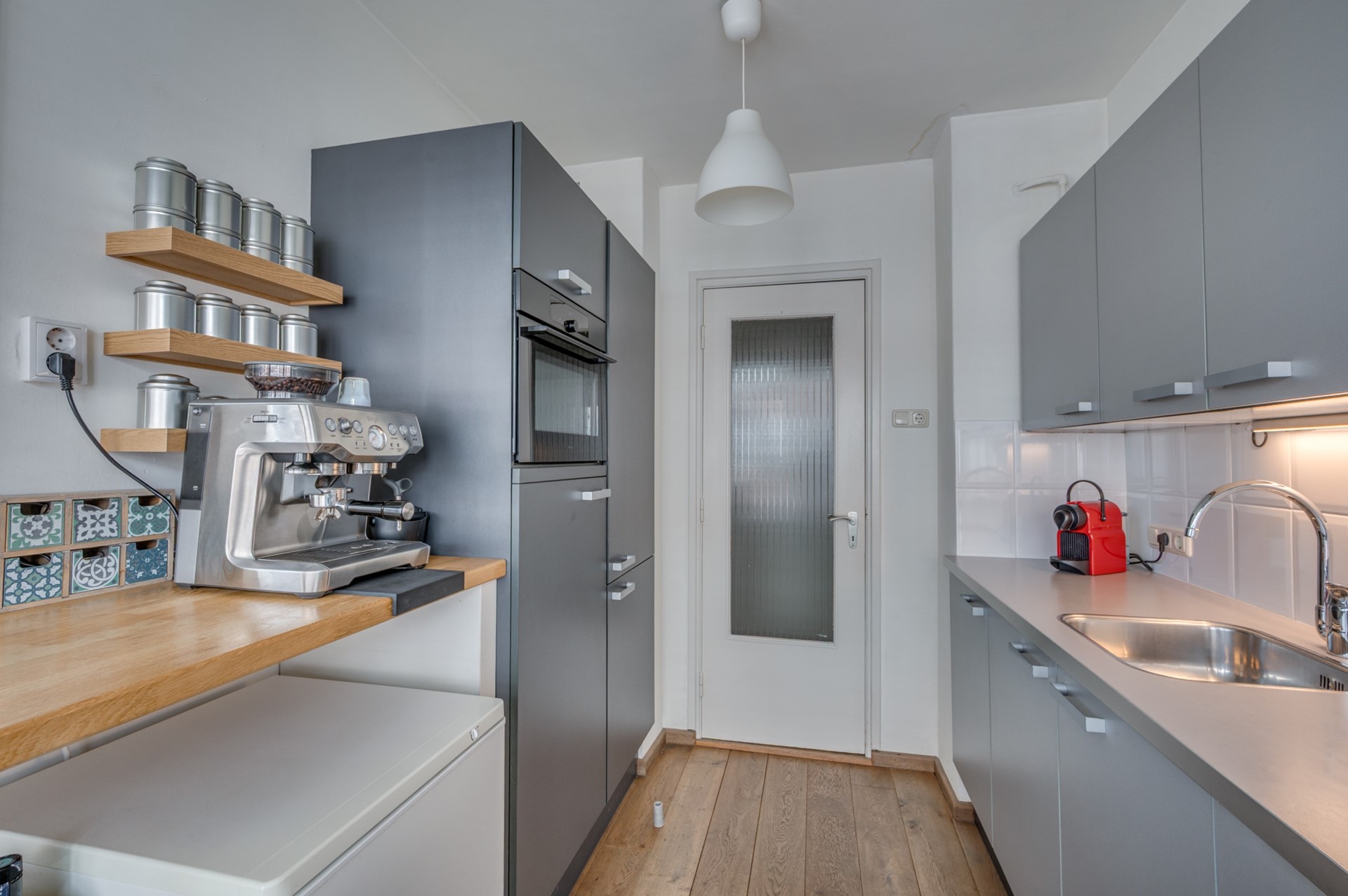 De gesloten keuken (9m²) is praktisch ingericht en voorzien van een complete inbouwcombinatie, waaronder een koelkast, diepvries, gaskookplaat, afzuigkap, combimagnetron en vaatwasser.