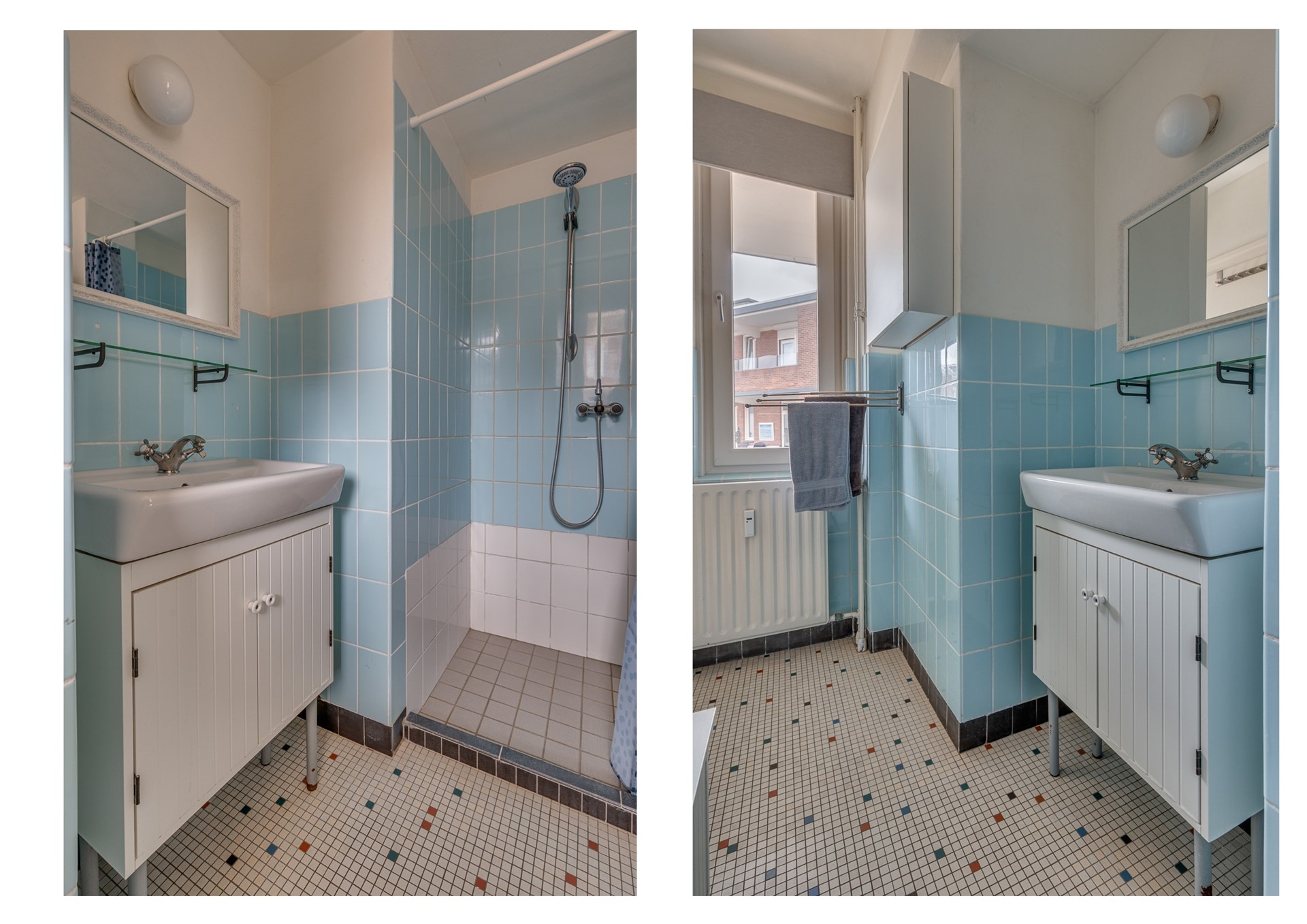 Het appartement beschikt over twee ruime slaapkamers (16m²/10m²). De badkamer is eveneens netjes betegeld en uitgerust met een douche en een modern wastafelmeubel. Daarnaast is er een balkon aanwezig waar u kunt genieten van de buitenlucht.