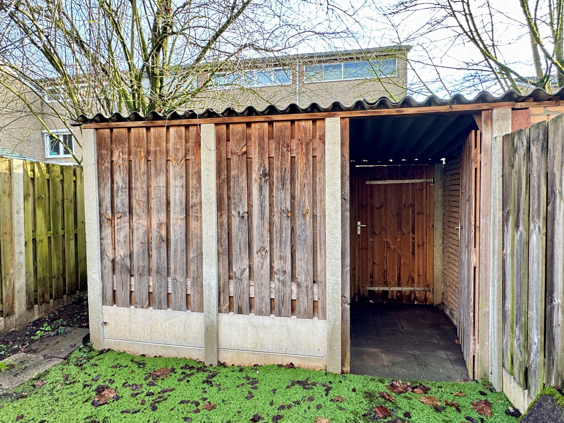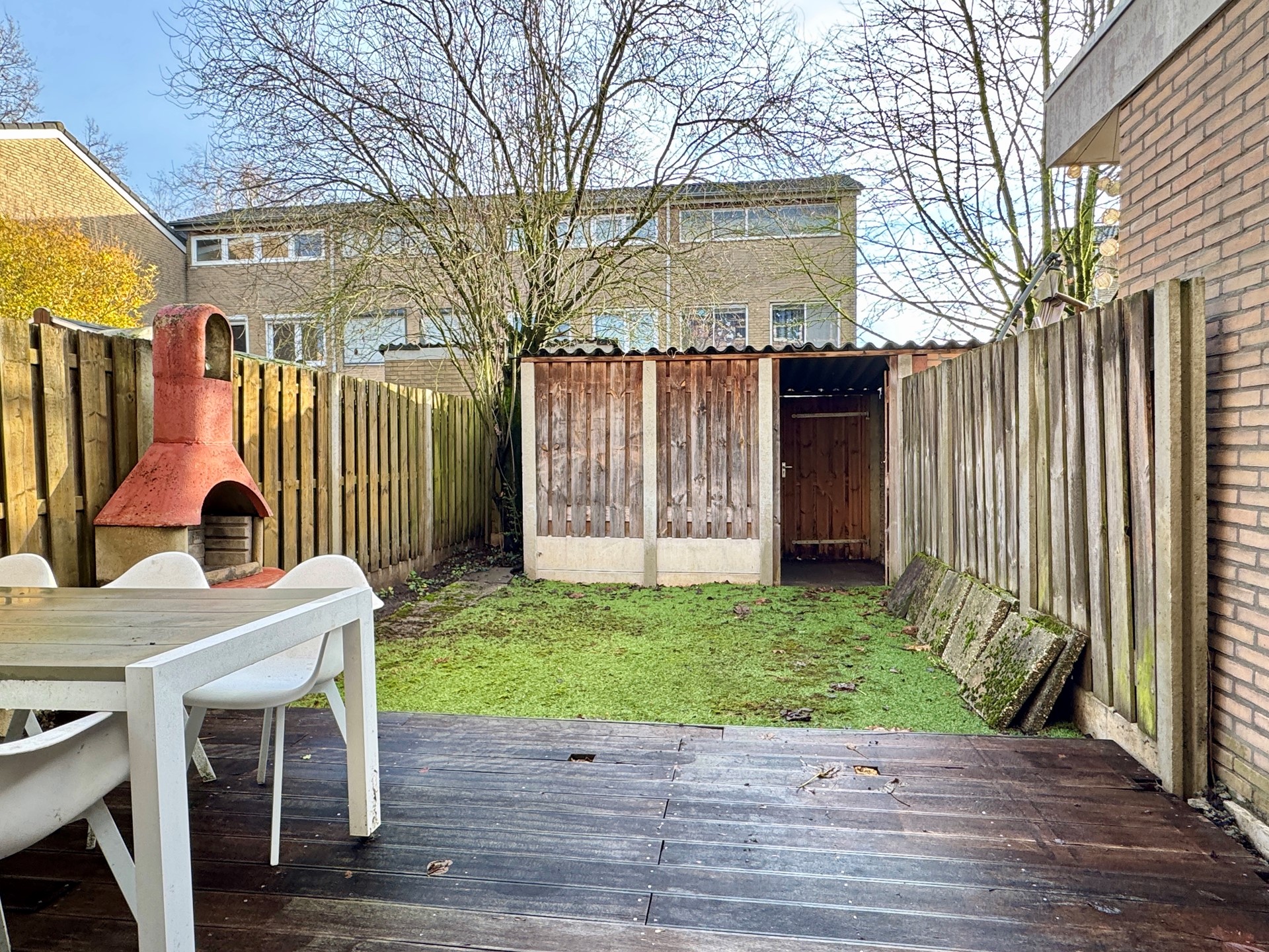 De tuin is gesitueerd op het Zuid-Oosten en voorzien van een terras (vlonder), houten berging en achterom. De garage (ca. 2.70 x 6.25m) is aan de voorzijde gesitueerd. De garage is voorzien van een vliering en elektrische poort. Grote oprit voor meerdere auto's geschikt.
