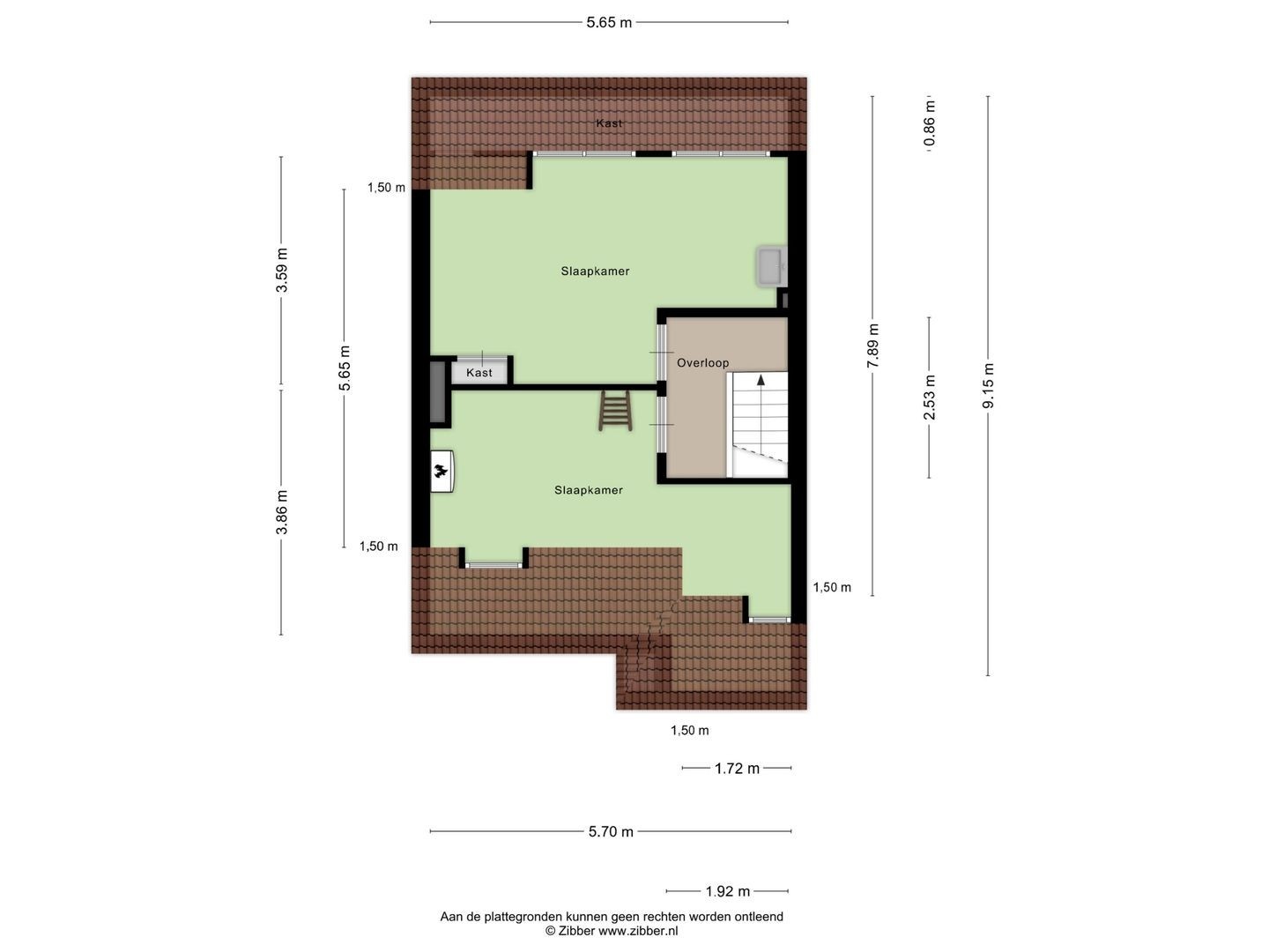 - Zolder (5,65 x ca. 2,50m) met toegang tot vliering.