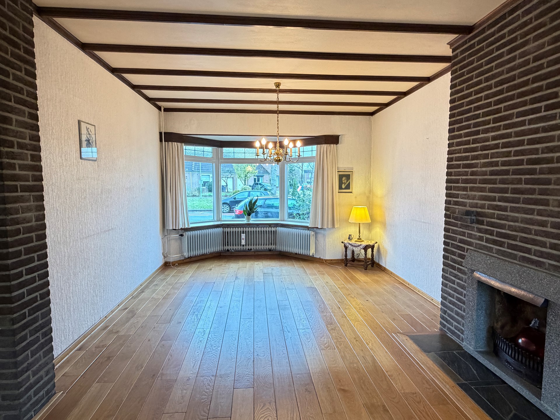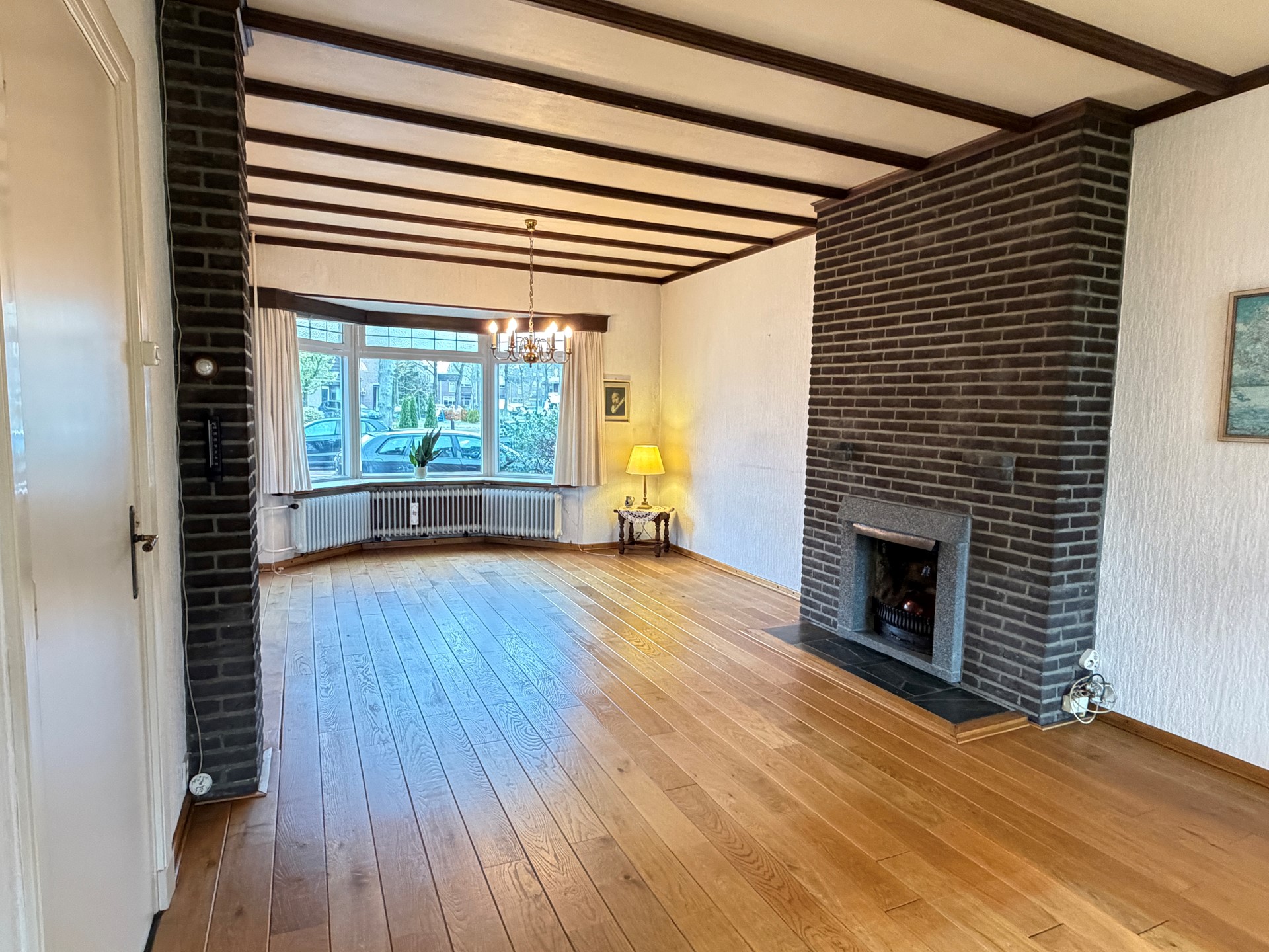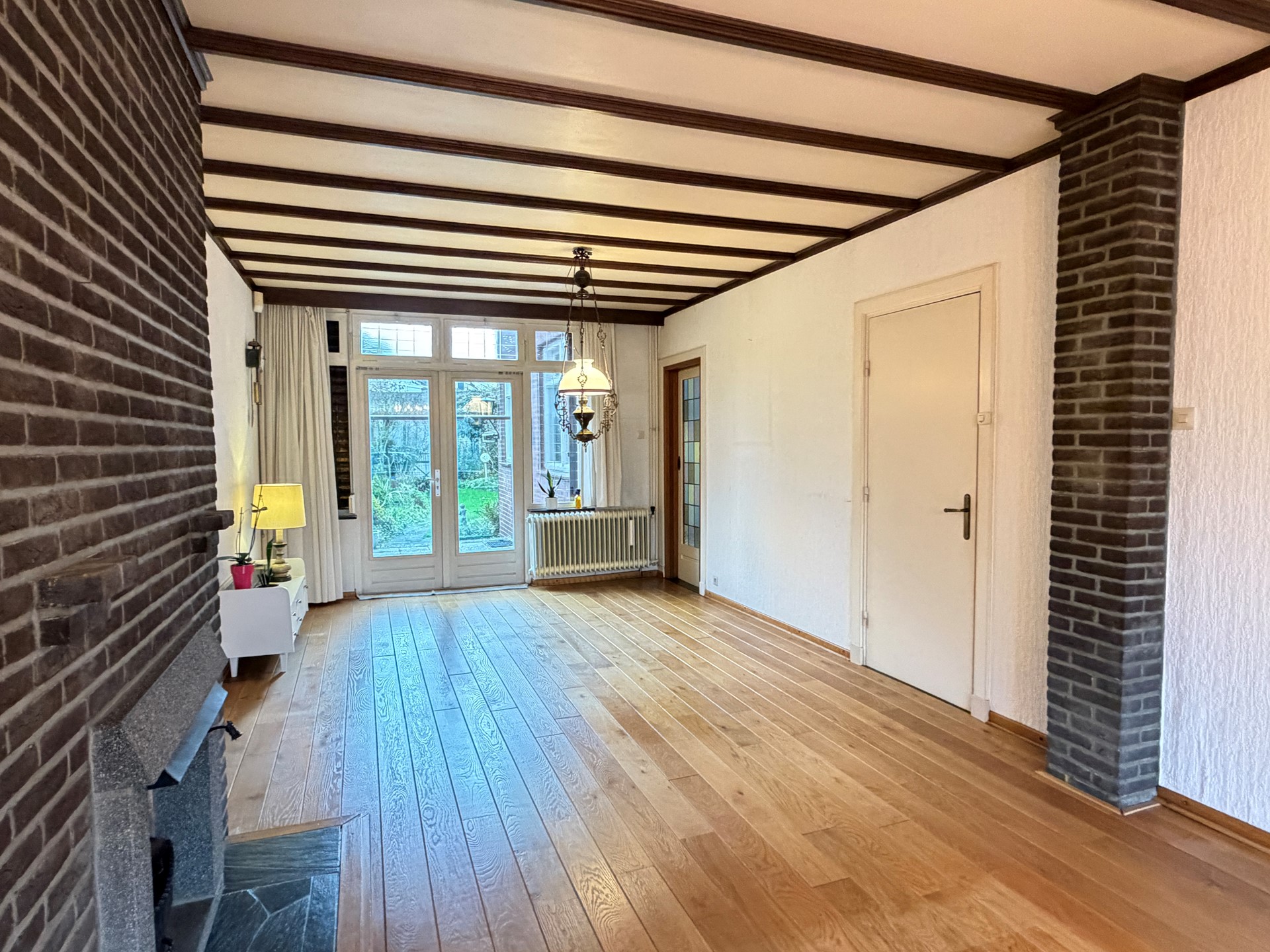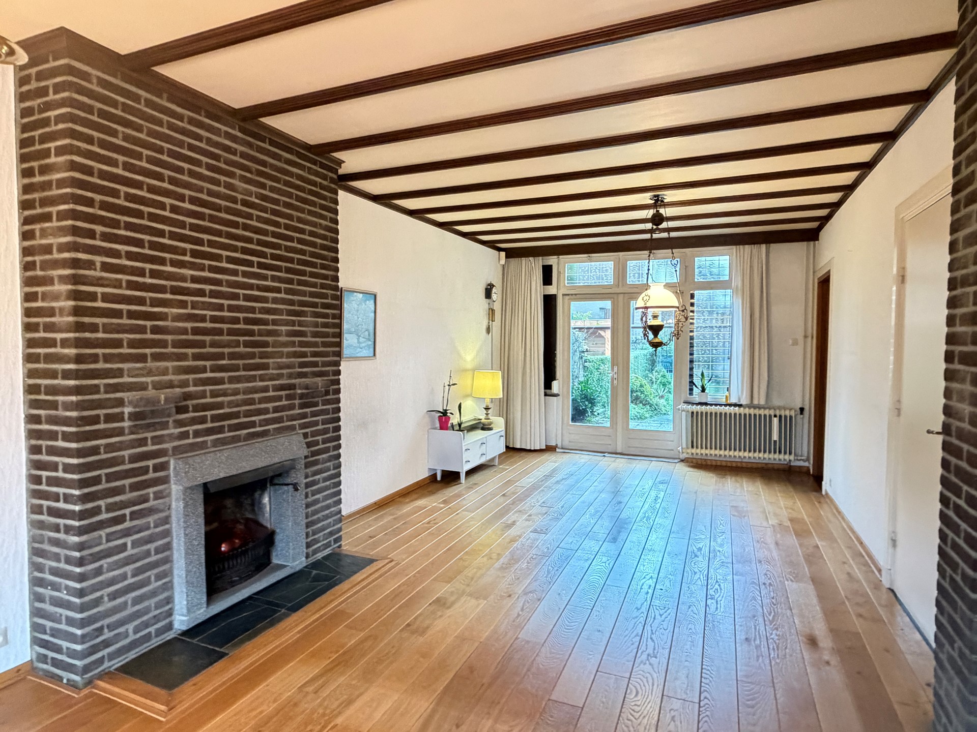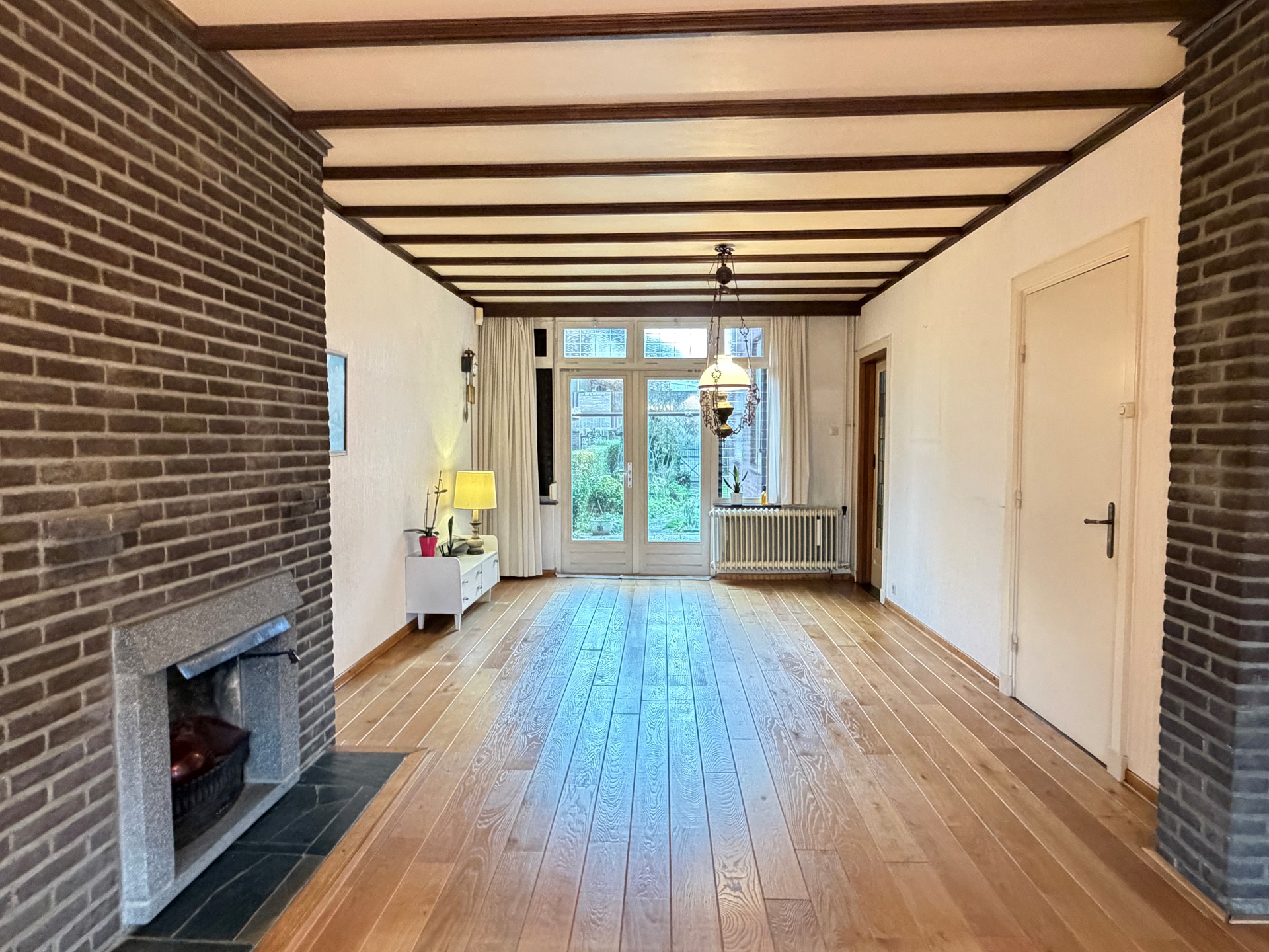 - Doorzonwoonkamer (ca. 34 m²) met veel lichtinval, houten vloer en schouw