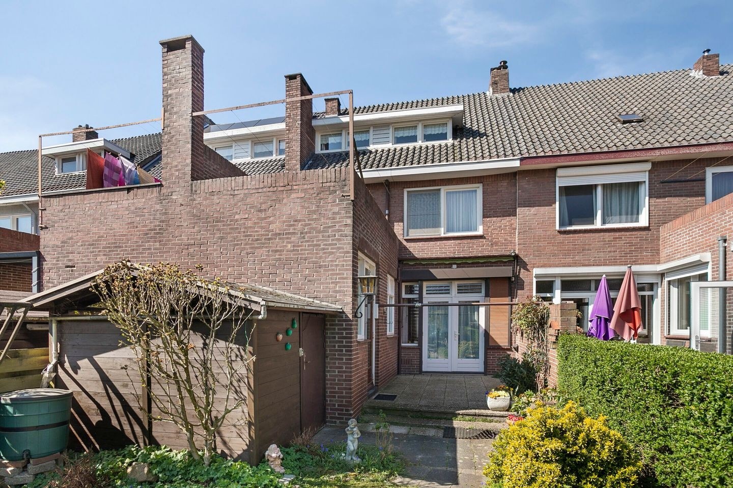 Groene, diepe achtertuin met terras, gras en beplanting. Aanwezig is een houten berging (5m²) voor fietsen en tuingereedschap. Een fijne plek om te ontspannen, tuinieren of te genieten van de zon.