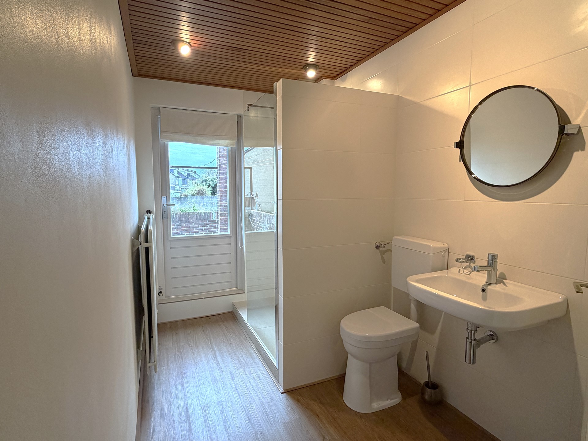 - Gemoderniseerde badkamer met douche, toilet en wastafel; toegang tot dakterras