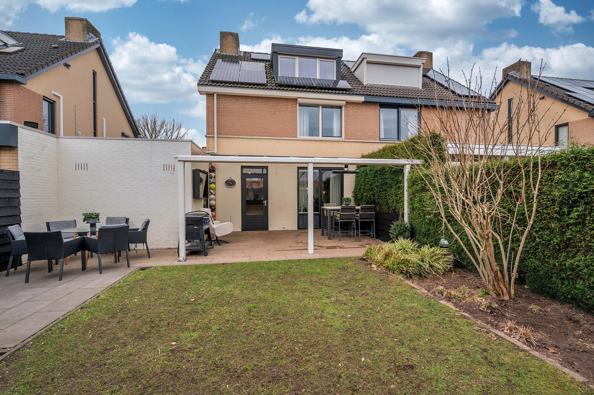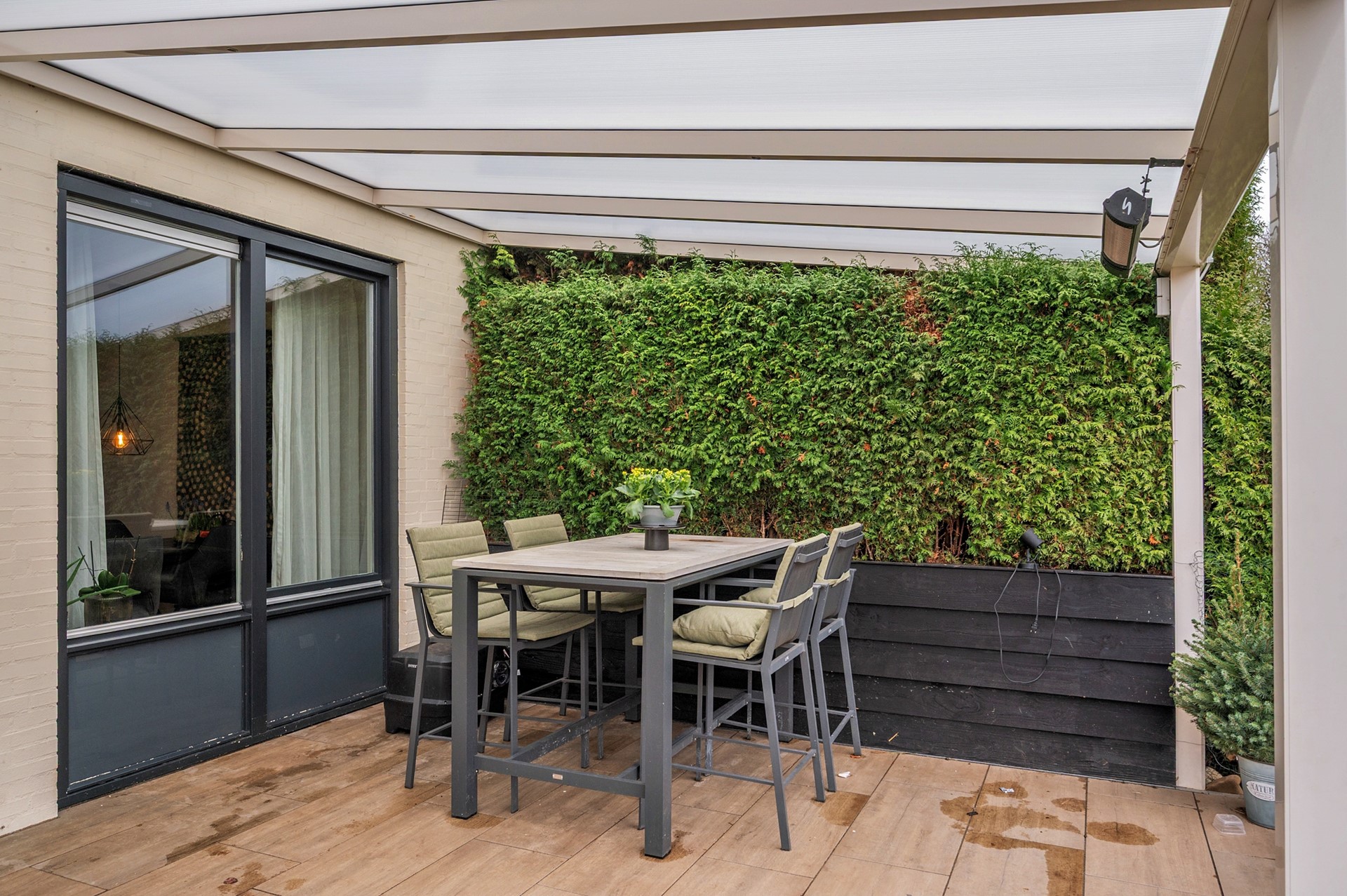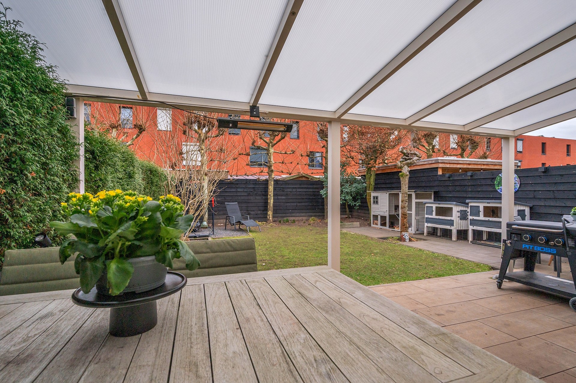 Buiten geniet je van een royale, verzorgde achtertuin op het zuidoosten, waar het dankzij de overkapping heerlijk vertoeven is. De aangebouwde garage beschikt over aansluitingen voor witgoed en een aparte loopdeur. Parkeren kan bovendien op eigen oprit.